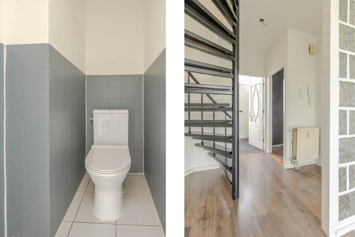 * Toiletruimte voorzien van grijze betegeling en duoblokopstelling.