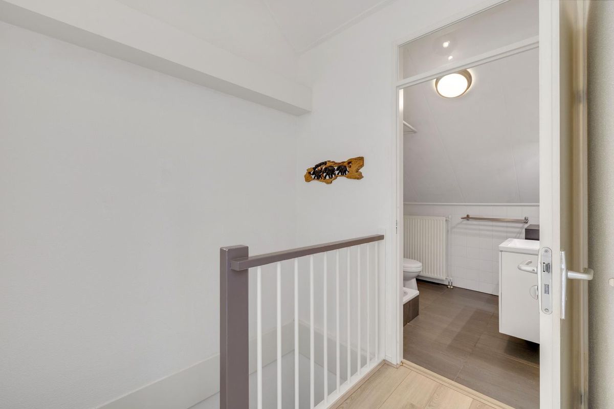 De betegelde badkamer is uitgevoerd met douche, 2e toilet, wastafelmeubel en verwarming.