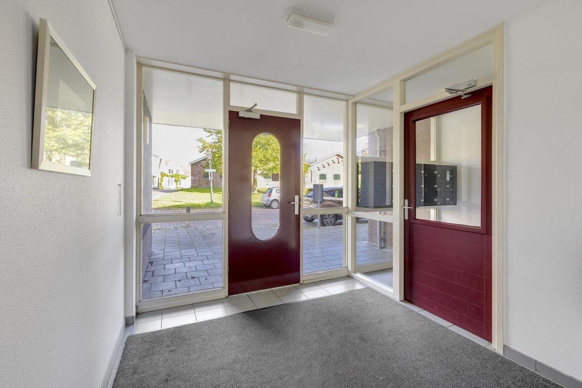 Afgesloten portiek met de brievenbussen, videofoon-installatie, trapopgang en de lift.