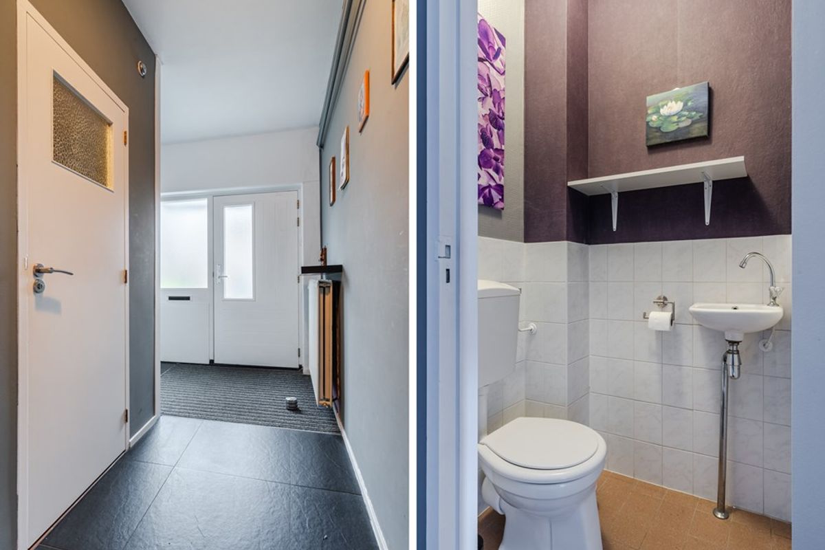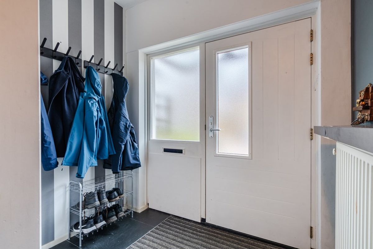 Er hangt een deurluifel boven de voordeur en de verwarmde entree binnen is zeer ruim van opzet, voorzien van een plavuizenvloer en bied ruimte aan de garderobe, de meterkast en een kleine ‘kruipruimte’ waar de watermeter zit. De hal geeft toegang tot de toiletruimte, de trap naar de etage, de trapkast met wasmachine aansluiting en tot slot de woonkamer.