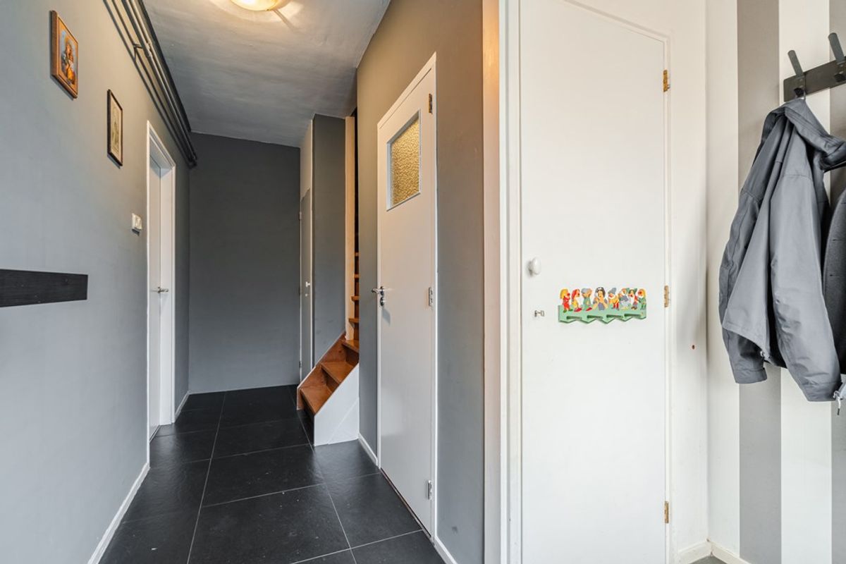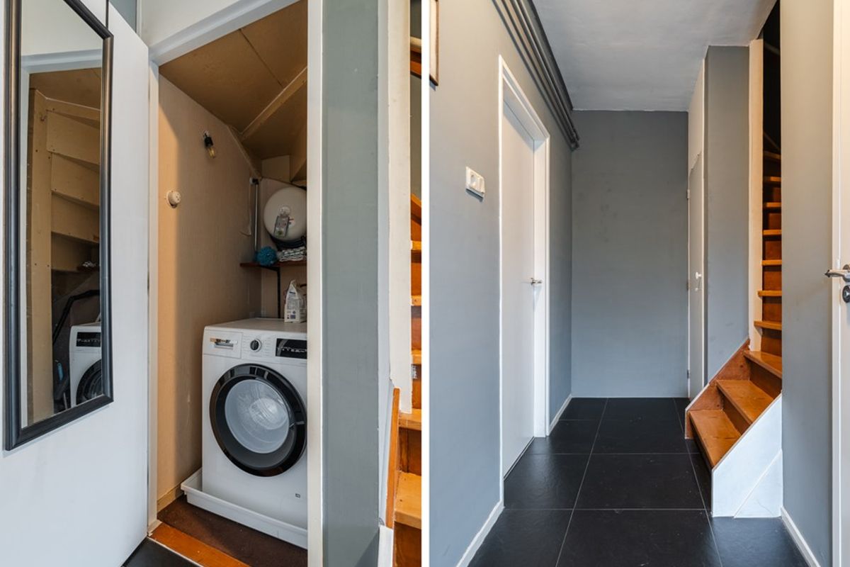 In de afsluitbare trapkast zijn de aansluitingen voor de wasmachine aanwezig, daarnaast is er nog extra bergruimte en een luik om toegang te krijgen tot de kruipruimte.