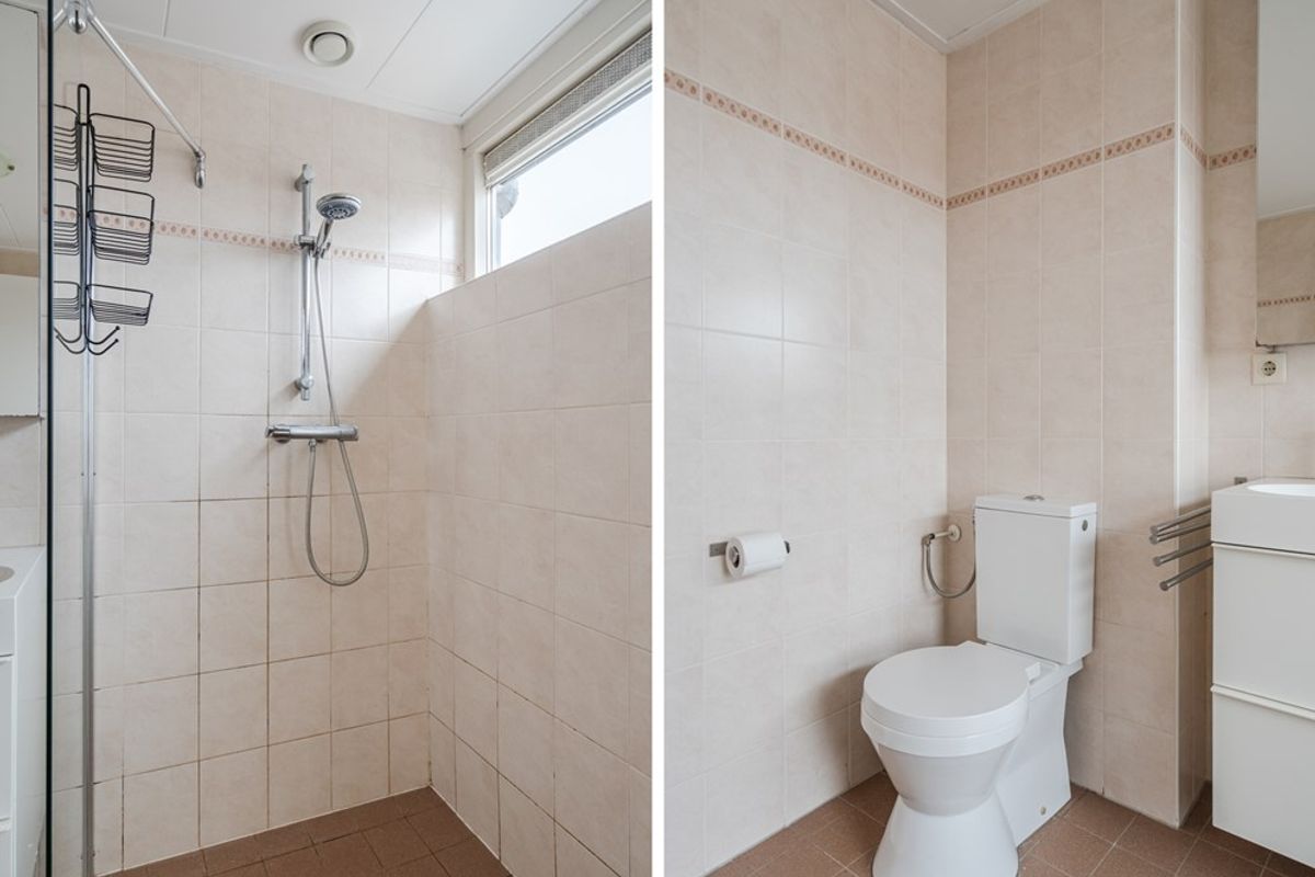 De badkamer is in 2012 vernieuwd, geheel betegeld en heeft veel daglichtinval. Er is een ruime inloop douchehoek met glazen scheidingswand en een thermostaatkraan, een dubbel wastafelmeubel met spiegelkast, 2 wandkasten en een 2e toilet.