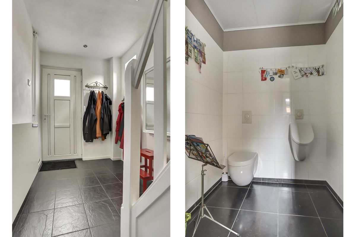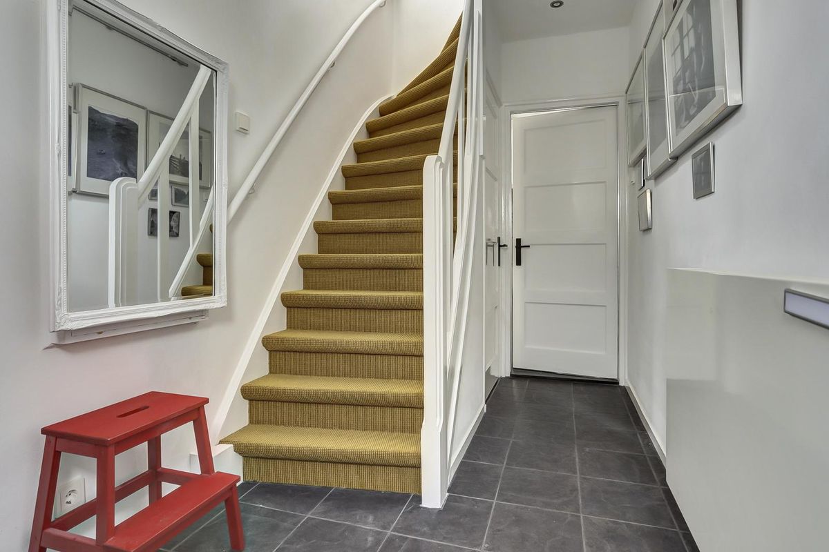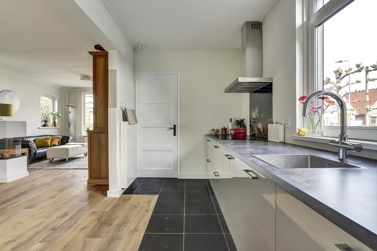 Bij aankomst valt direct de karakteristieke gevel op, met zijn fraaie lijnen, donkere kozijnen en rode dakpannen. Via de voordeur komt u binnen in de hal met trapopgang en toegang tot de keuken. De keuken is praktisch ingericht en voorzien van moderne apparatuur, waaronder een inductie kookplaat, afzuigkap, vaatwasser en kokend waterkraan. De donkere vloertegels geven de ruimte een moderne en onderhoudsvriendelijke uitstraling. De keuken staat in directe verbinding met de woonkamer, wat zorgt voor een fijne open leefruimte.
