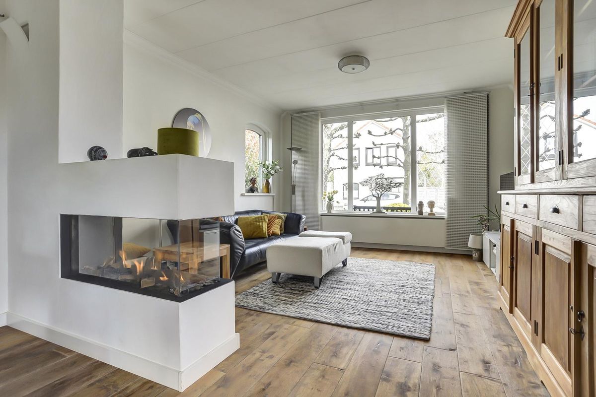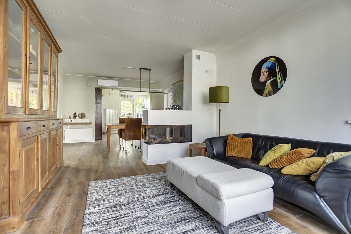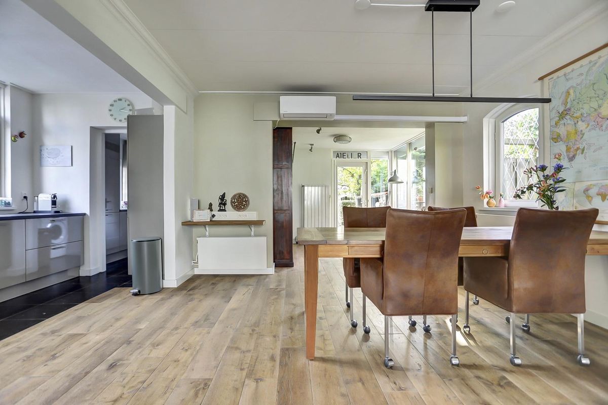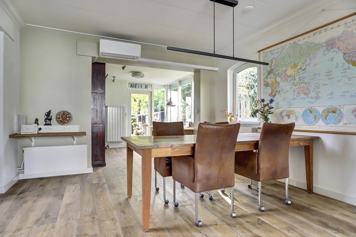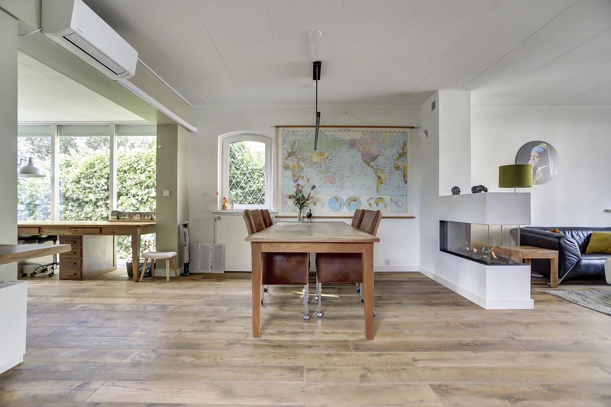 De woonkamer is een warme en uitnodigende leefruimte met grote ramen die zorgen voor veel lichtinval. De gashaard vormt het hart van de kamer en brengt extra sfeer en gezelligheid. De houten vloer, lichte wanden en authentieke details creëren een tijdloze en huiselijke uitstraling. Bovendien is er airconditioning aanwezig, zodat het in elk seizoen aangenaam vertoeven is. Aansluitend bevindt zich de eetkamer, met ruimte voor een grote eettafel. Ideaal voor gezellige diners met familie of vrienden.