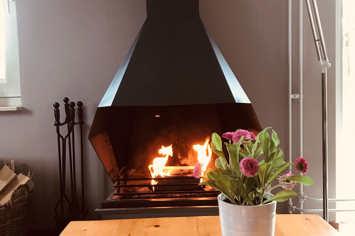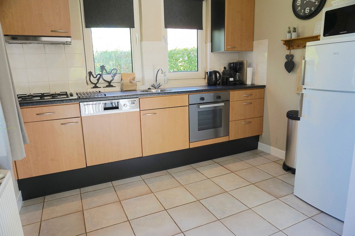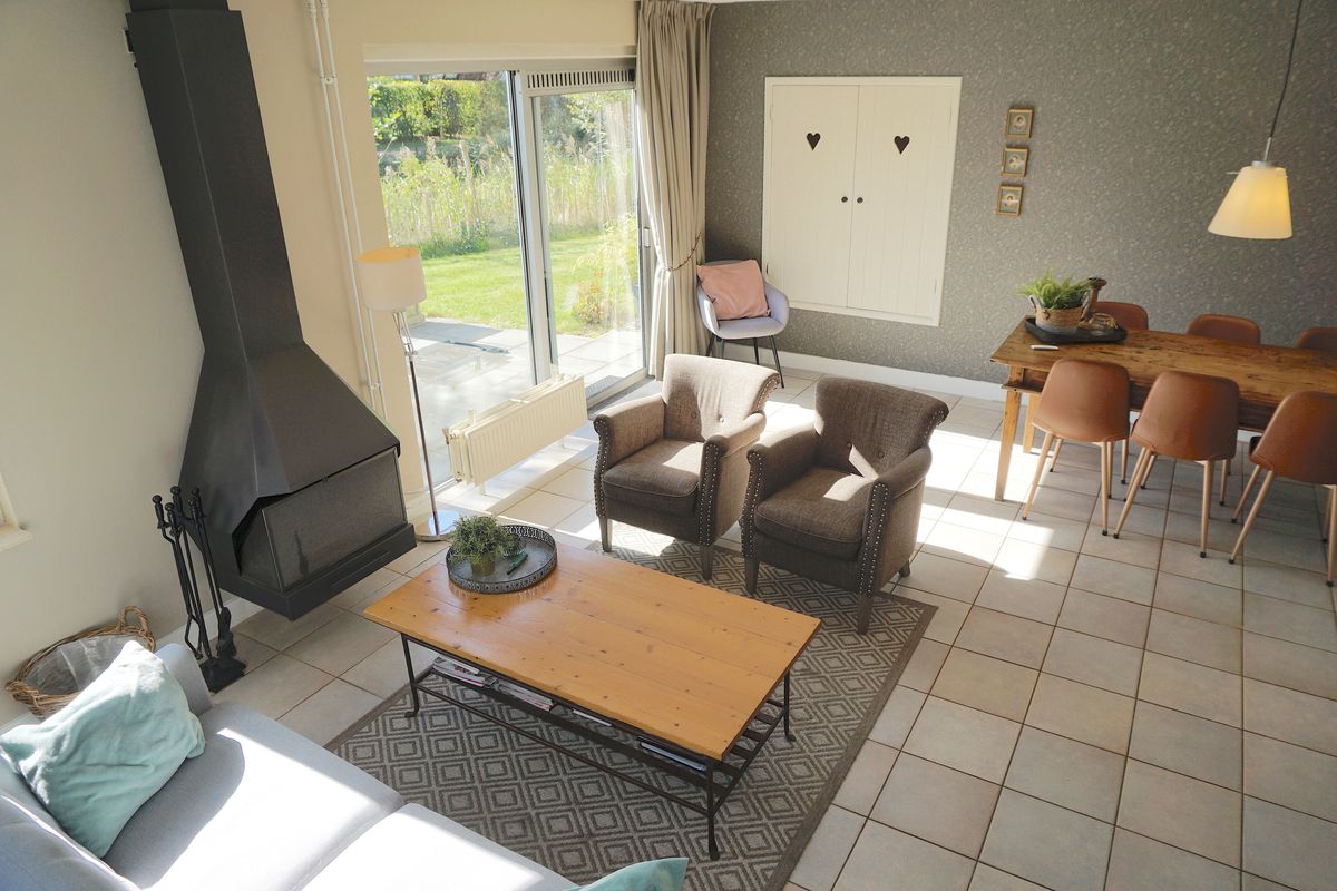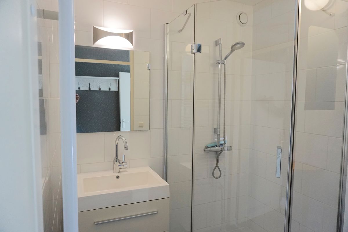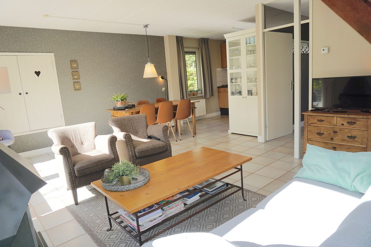 Entree, hal, toilet, meterkast, badkamer voorzien van douchecabine, wastafel en designradiator. Woonkamer met open haard, open keuken, 2 persoons bedstee, schuifpui naar terras op het zuidwesten met elektrische luifel. Open keuken voorzien van keukeninrichting met diverse inbouwapparatuur o.a. kookplaat (gas), afzuigkap, vaatwasser, oven, grote vrijstaande koelkast met vriesvak en magnetron. Extra ruime inpandige berging met witgoedaansluiting, wasmachine, droger en opstelling CV-ketel.