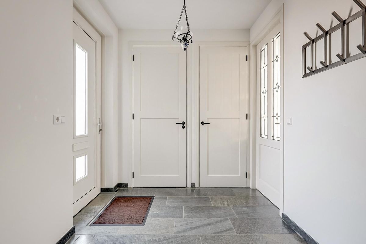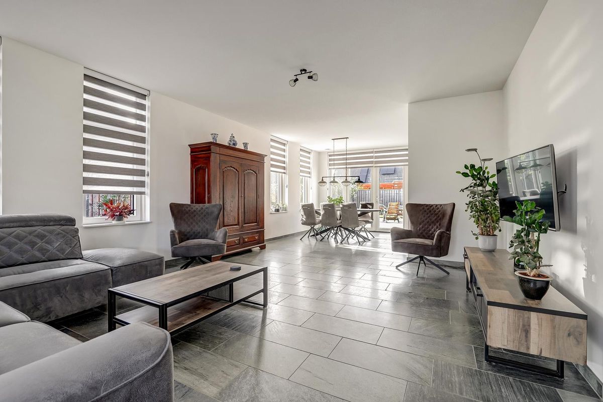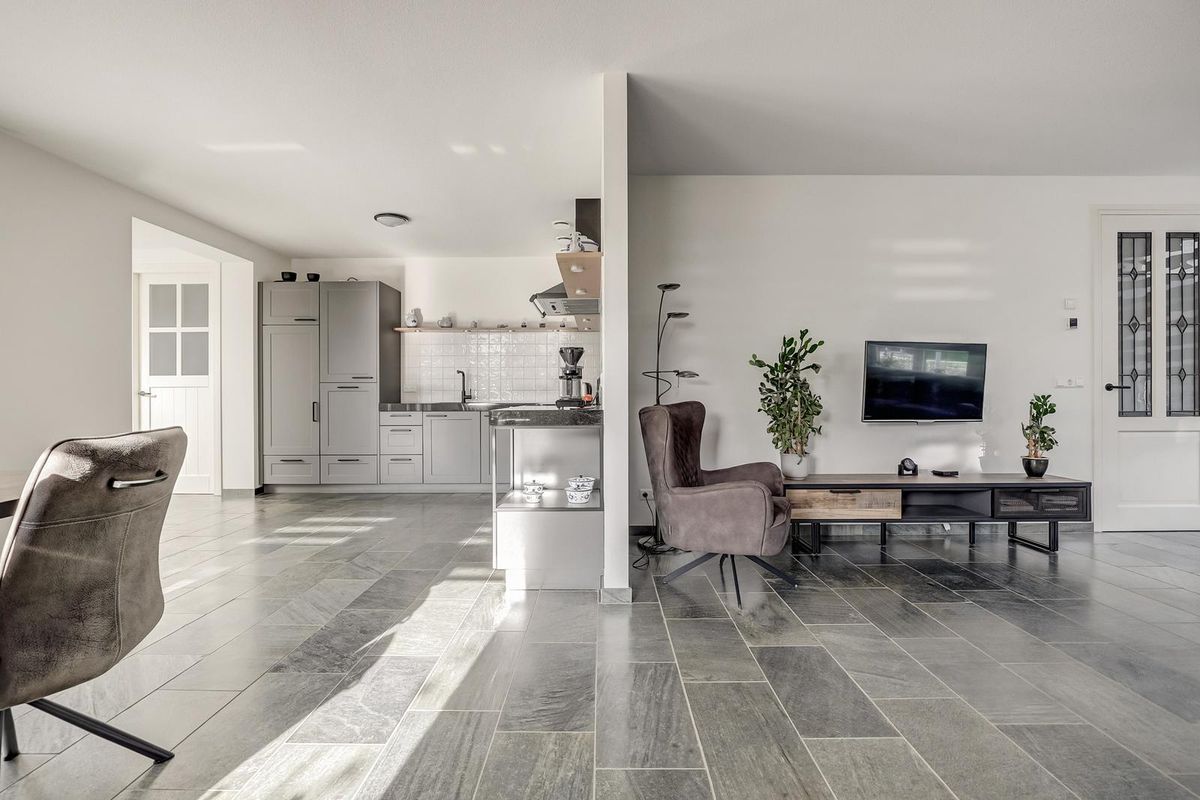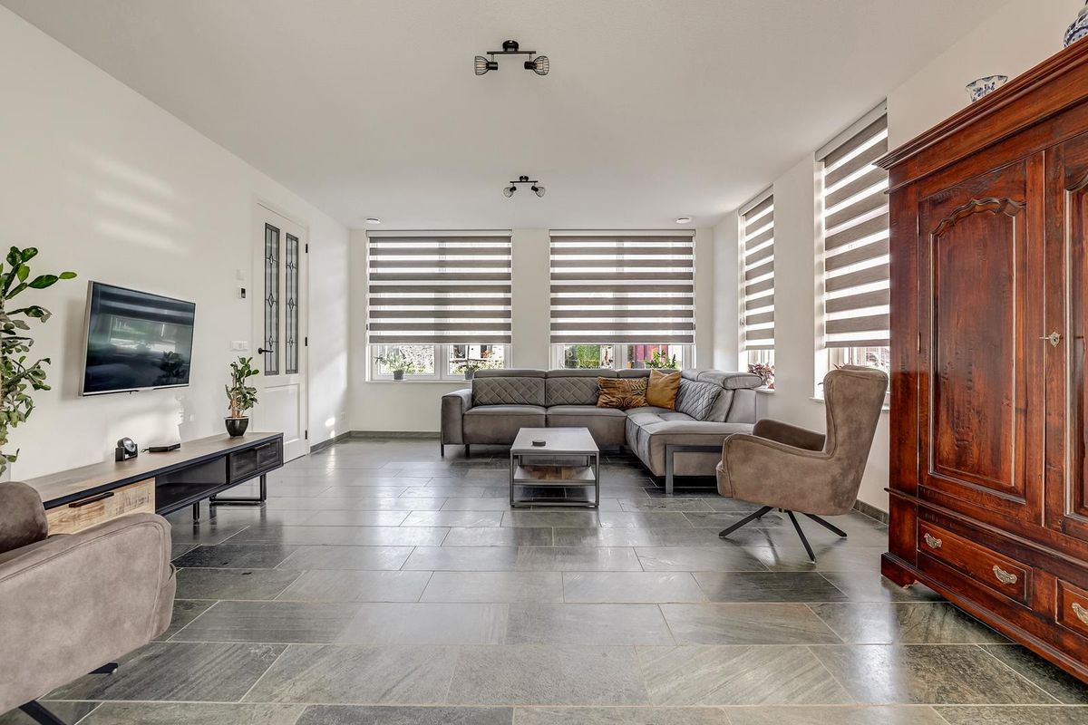 Via de oprit bereikt u de overdekte entree. De hal is ruim opgezet met meterkast, trapopgang en modern toilet. Vanuit de hal stapt u de royale living binnen, een lichte woonkamer met grote raampartijen rondom en brede vensterbanken. De vloer is afgewerkt met donkergrijze natuursteen (leisteenlook) die doorloopt naar eetkamer en keuken, dit zorgt voor een rustige en luxe uitstraling.
