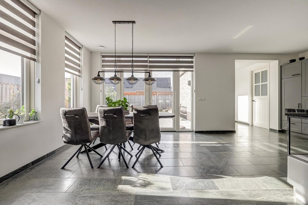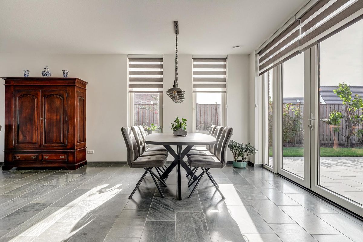 Aan de tuinzijde ligt de eetkamer met dubbele tuindeuren naar het terras. Aangrenzend de half open keuken met een moderne hoekopstelling zoals matgrijze fronten, zwart granieten werkblad en glanzend witte vierkante wandtegel. De keuken is voorzien van een breed fornuis met meerdere ovens en afzuigkap, een geïntegreerde koel/vrieskast en veel bergruimte in lades en hoge kasten.
