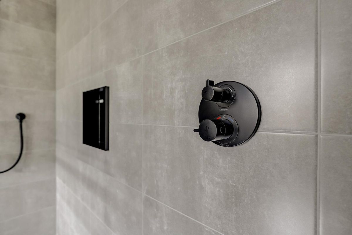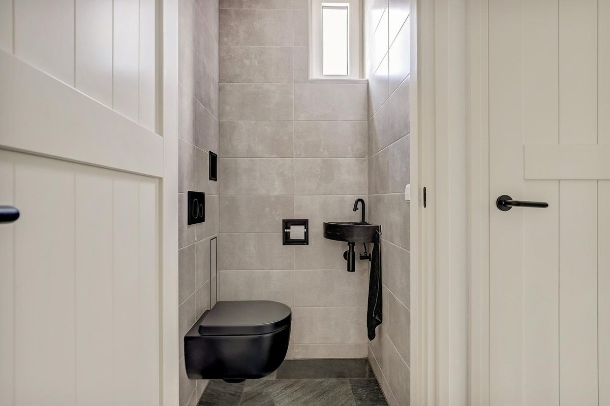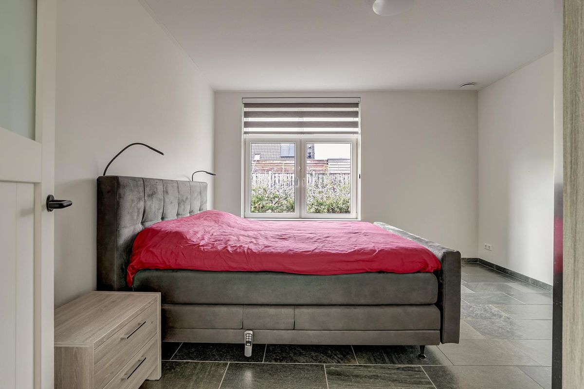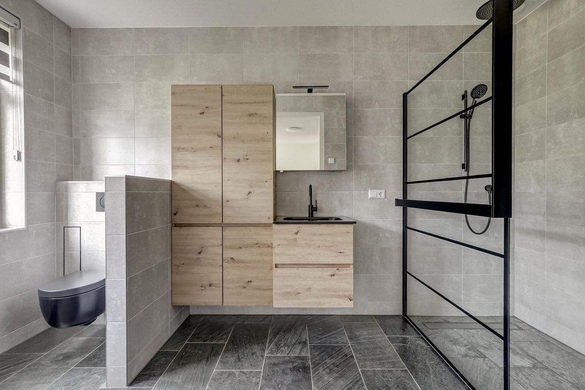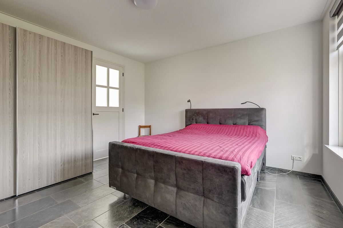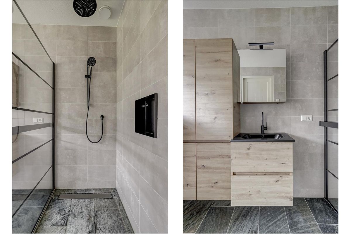 Als u wat verder doorloopt vindt u een volwaardige slaapkamer op de begane grond gesitueerd met directe toegang tot de moderne badkamer. De badkamer is eigentijds afgewerkt met grote grijsbeton-tegels tot aan het plafond, een inloopdouche met zwarte stalen glaswand, toilet, houtlook meubel met matzwarte kraan en een wandcloset.