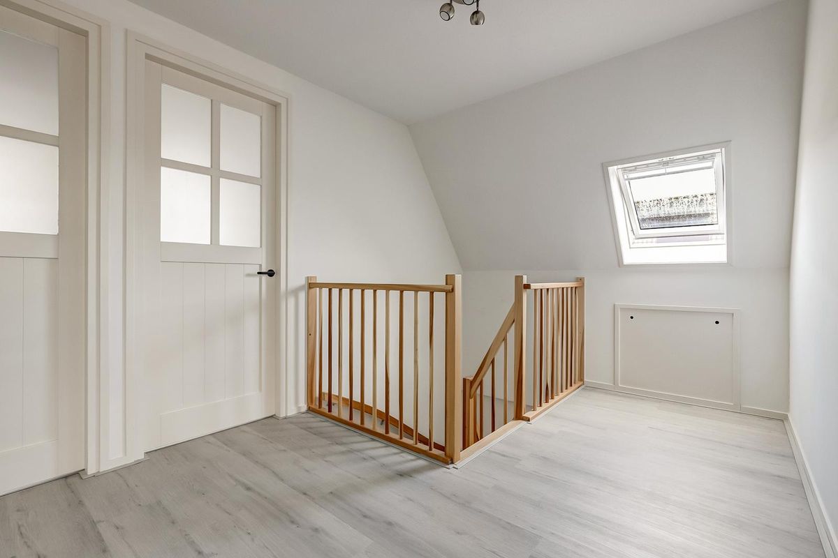 De eerste verdieping biedt vier goed bemeten slaapkamers rondom een centrale overloop. De kamers hebben schuine wanden tot in de knieschotten en daardoor prettige plaatsingsmogelijkheden voor kasten/bedden.
