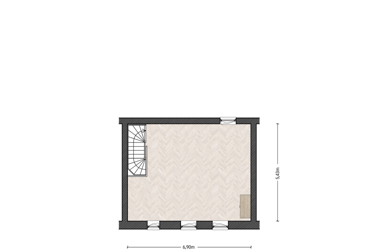 BEGANE GROND: entree woning, meterkast, technische ruimte met opstelplaats warmtepomp, kast met warmwaterboiler. Toilet met fonteintje, keuken met aansluitpunten voor de inbouw keuken, woonkamer met toegang tot de achtertuin, slaapkamer met toegang tot de badkamer met douche, wastafelmeubel, 2e toilet en wasmachine- en drogeraansluiting. Achtertuin met achterom, houten schuur en zijtuin. 1e VERDIEPING: grote multifunctionele ruimte met vrije indeling. DAK (plat): opstelplaats zonnepanelen.