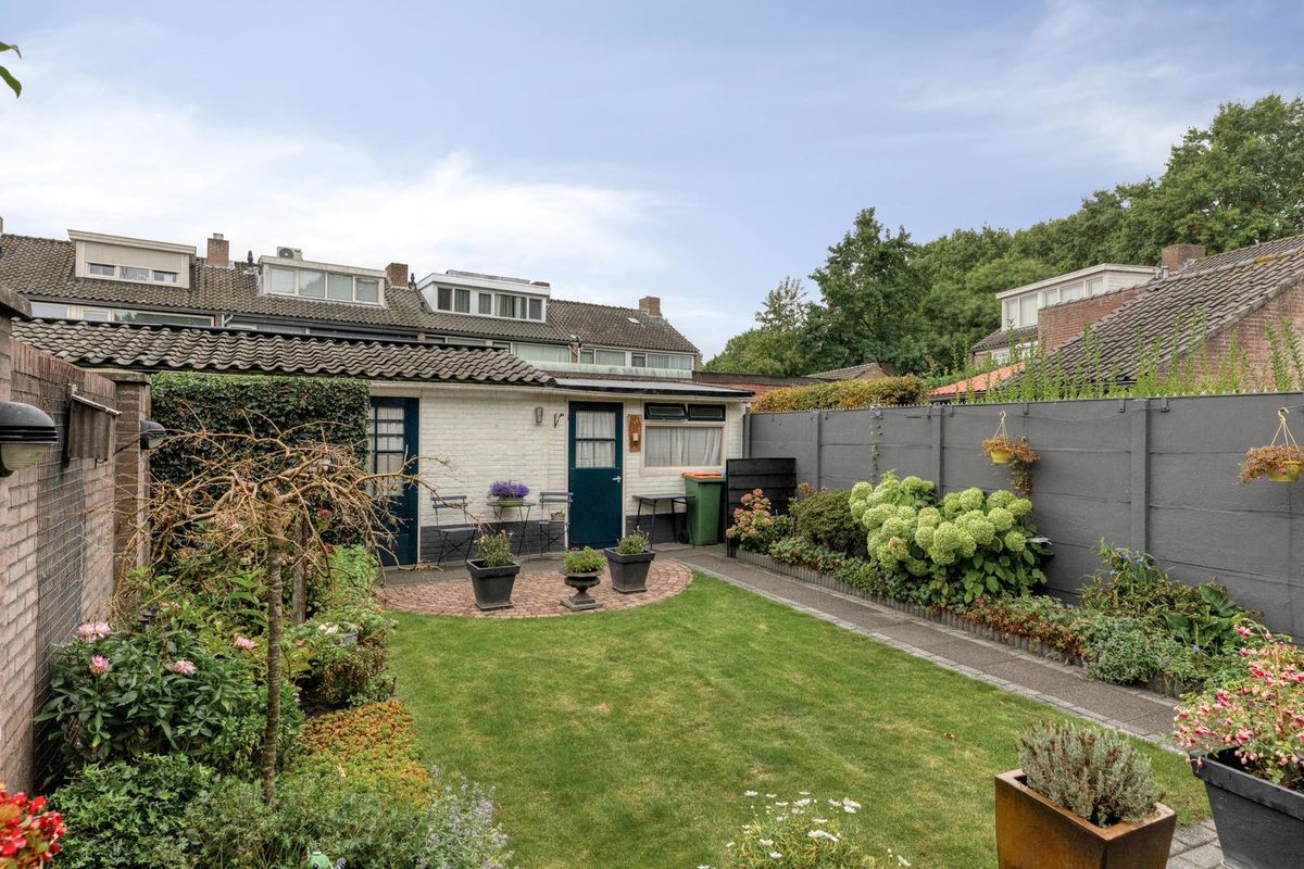 In de sfeervolle tuin vind je leuke bestrating, stenen schutting, beplanting, gazon en stenen bergingen. De berging rechts biedt de aansluiting van de wasapparatuur en is geïsoleerd en verwarmd. Een poort aan de zijkant biedt toegang tot de brandgang.