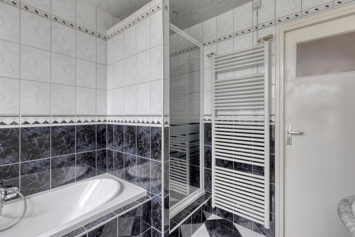 De ruime badkamer is geheel betegeld en je treft hier een ligbad, douche, hangcloset en wastafelmeubel.