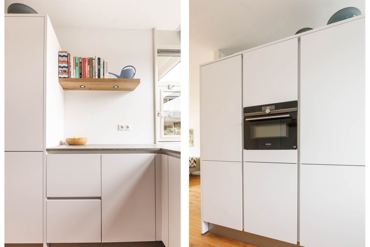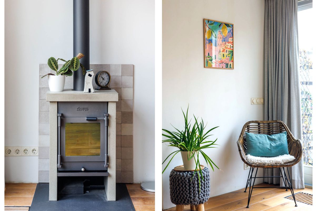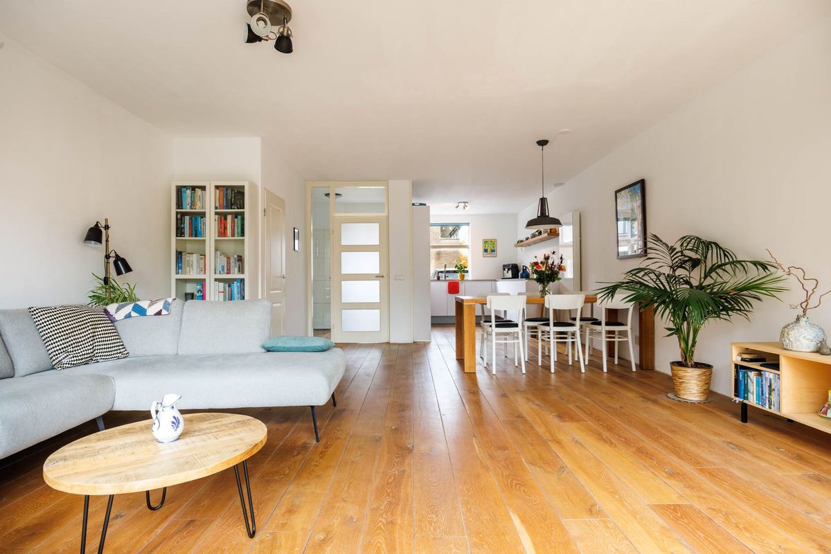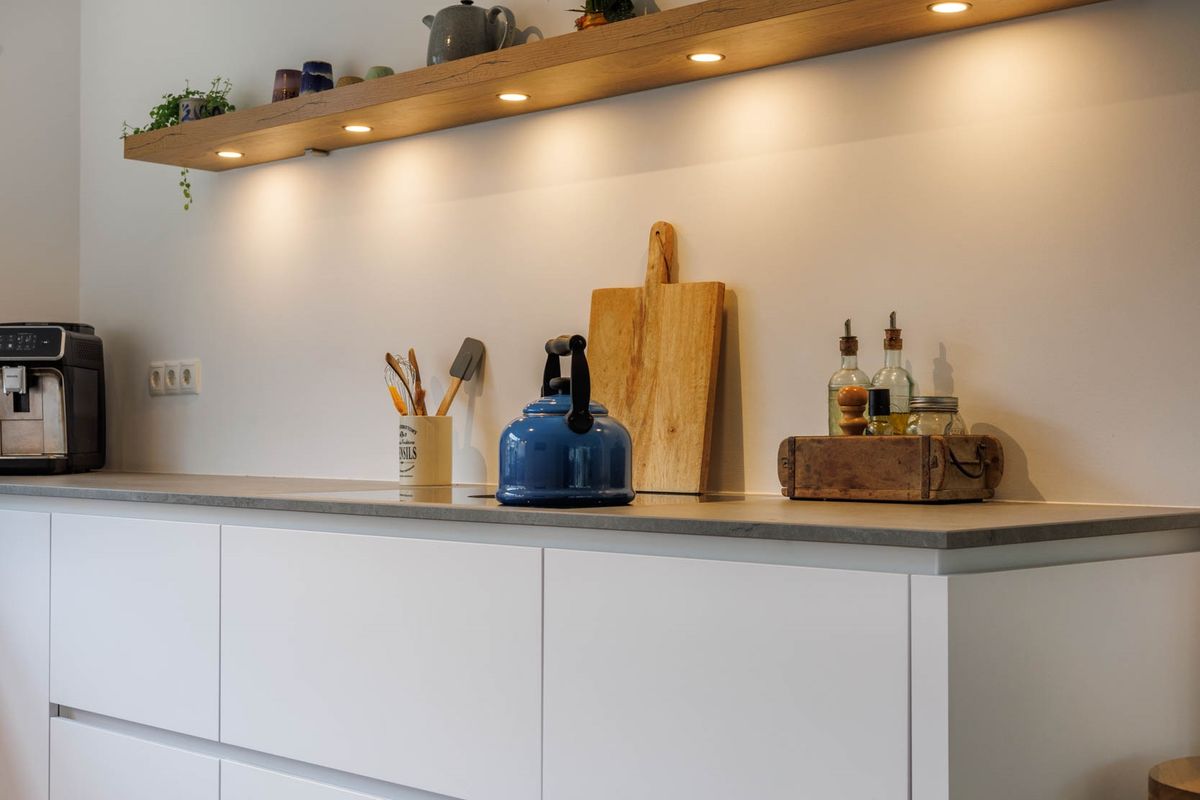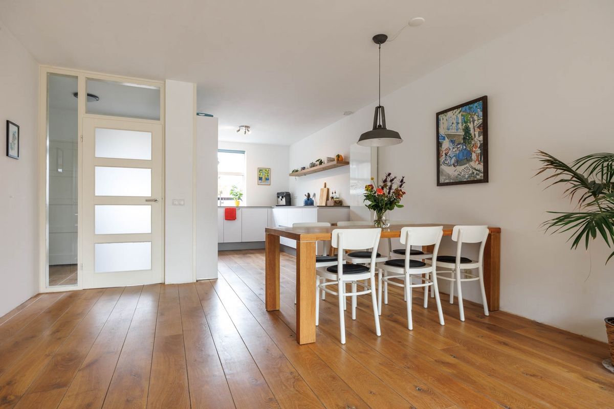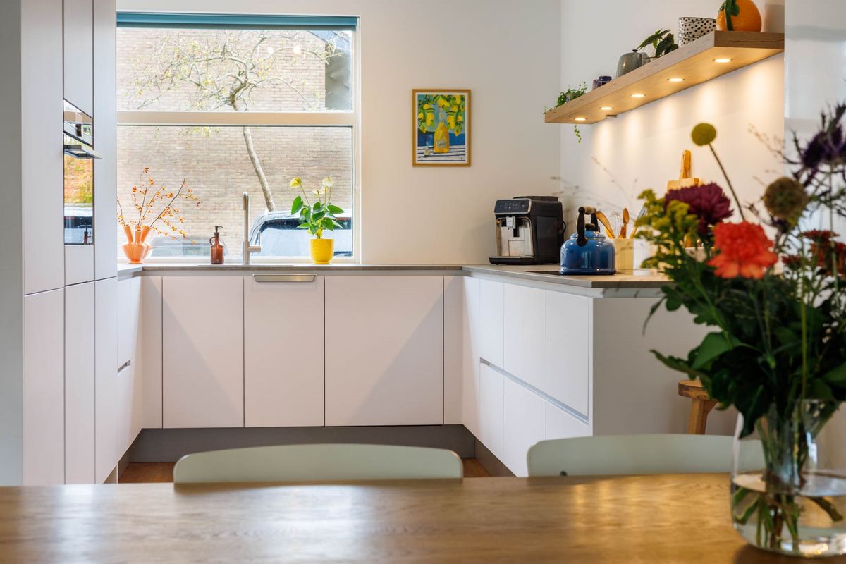 Entrance into a spacious hallway with a toilet and sink, and access to the beautiful extended living room. The floor is finished with solid oak parquet. For both warmth and atmosphere, there is a soapstone wood-burning stove that heats the entire space efficiently. The extension features large sliding doors to the south-facing garden, allowing plenty of natural light to fill the room. The generous and modern kitchen is equipped with a Dekton worktop and various built-in appliances, including an induction hob with integrated extractor, a combination steam oven/microwave, a dishwasher, and a fridge-freezer.