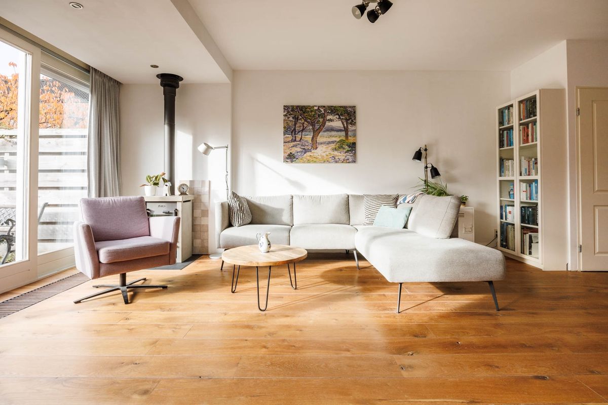Entree met een royale hal. Hier is een toilet met fonteintje en toegang tot de fraaie uitgebouwde woonkamer. Op de vloer ligt een massief eikenhoutenparket. Voor zowel sfeer als warmte staat er een spekstenen houtkachel, die de hele ruimte goed verwarmt. De uitbouw is voorzien van een grote schuifpui naar de tuin op het zuiden, waardoor de ruimte heerlijk licht en zonnig is. De royale en moderne keuken is uitgerust met een Dekton werkblad en diverse inbouwapparatuur, waaronder een inductiekookplaat met geïntegreerde afzuiging, een combi-stoomoven/magnetron, een vaatwasser en een koel-vriescombinatie.