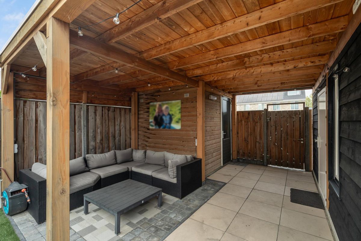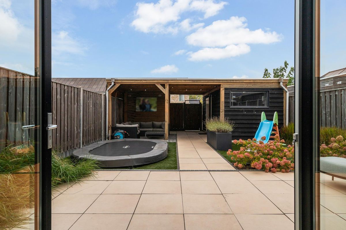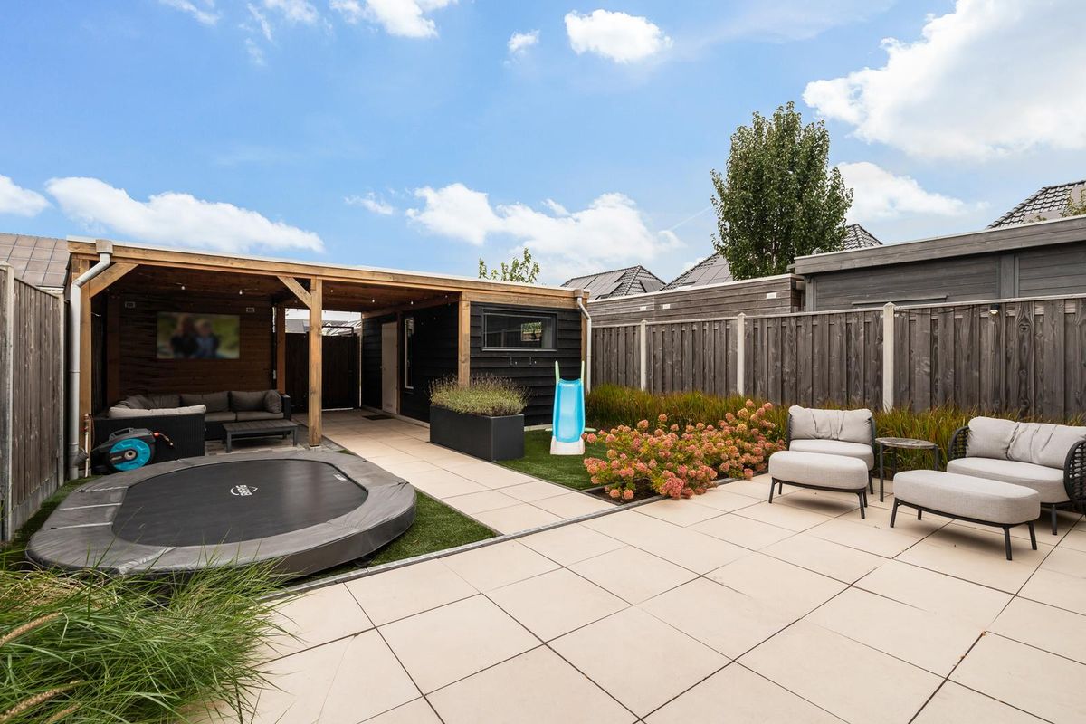 Via de dubbele openslaande deuren is de achtertuin bereikbaar, die goed op de zon ligt (noordwest) en uitzonderlijk groot is. Aan ruimte geen gebrek dus. Direct tegen de woning ligt het hoofdterras met elektrisch bedienbaar zonnescherm, aan de zijkanten zijn 2 delen met kunstgras en achterin is een overkapping met overdekt terras. Er is niet alleen een gebruikelijke berging/schuur, maar ook een ruim tuinhuis met elektra (en aparte elektrameter) en boiler. De mogelijkheden zijn hier eindeloos: van hobbyruimte tot thuiskantoor of van sportkamer tot mancave. Het kan hier allemaal! Direct achter de tuin liggen de eigen parkeerplaatsen op eigen terrein, waar je met gemak 3 auto’s kunt parkeren. Je elektrische auto laad je hier makkelijk op door de laadpaal die aanwezig is.