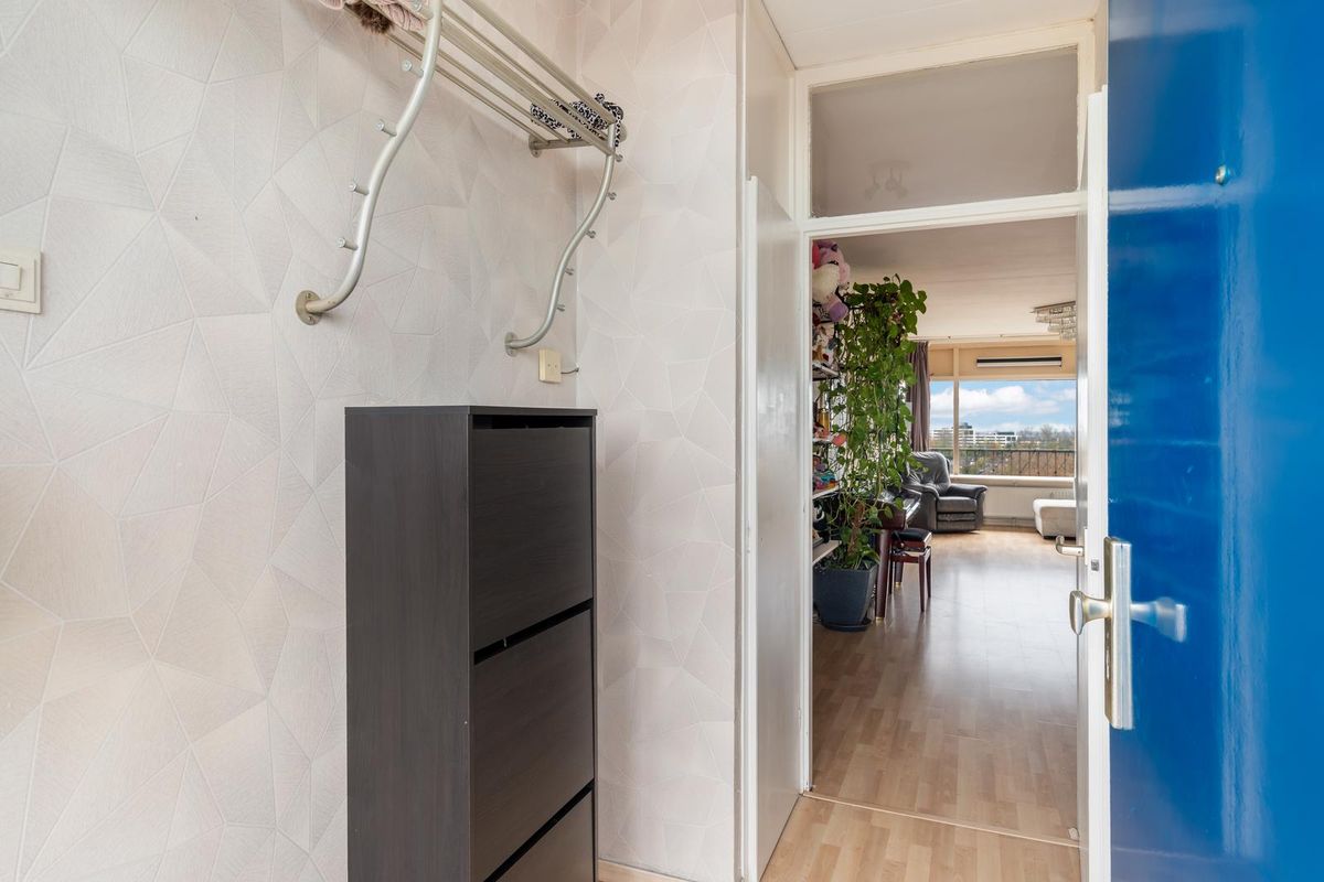 Via de galerij op de 10e etage kom je binnen in de woning via een tochtportaal met vernieuwde meterkast en doorloop naar de woonkamer. De royale living is dankzij de grote raampartijen en ligging op het zuidwesten aangenaam licht en geeft een mooi panorama over het omliggende groen. Aan de voorzijde van de woonkamer ligt de afgesloten keuken, deze is erg praktisch ingedeeld en voorzien van diverse inbouwapparatuur.