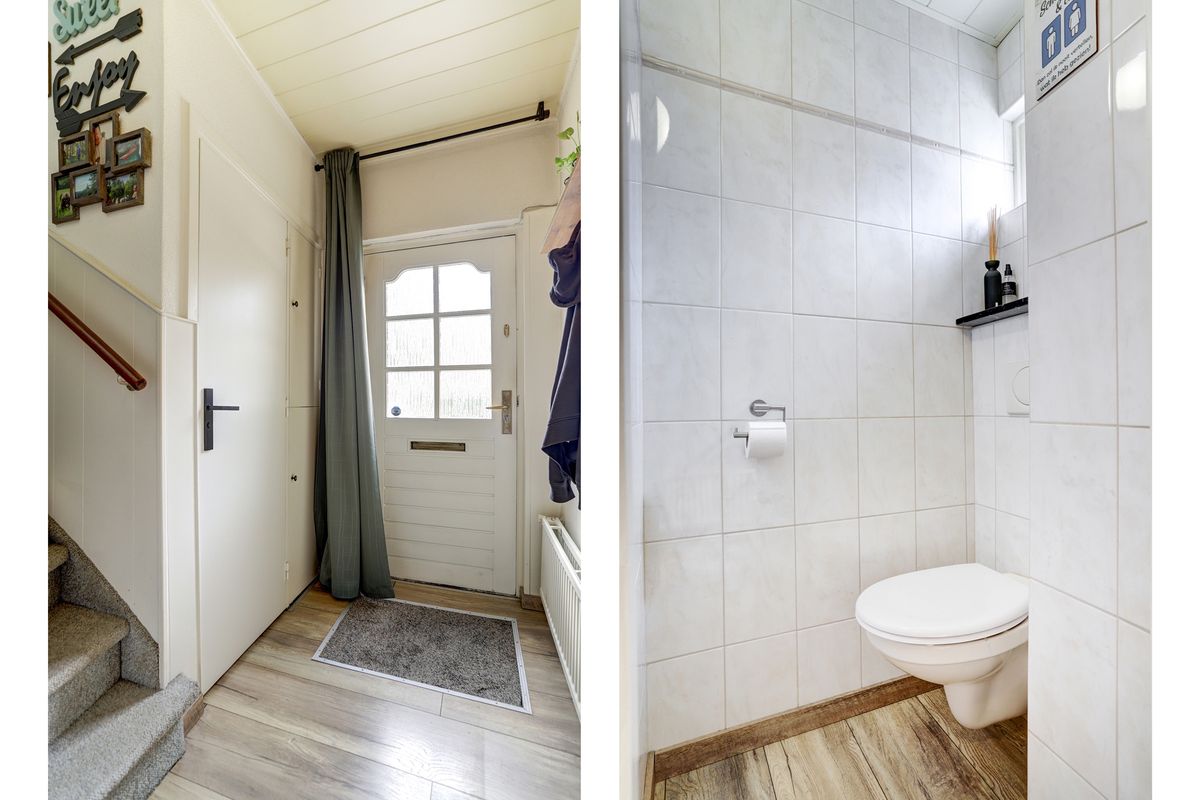 Aan de rechterzijde bevindt zich de keurig betegelde toiletruimte, voorzien van een hangcloset. Daarnaast vind je de meterkast (stoppenkast vernieuwd in 2022) en de trap naar de eerste verdieping. Aan de linkerzijde is er plek om je jas op te hangen.