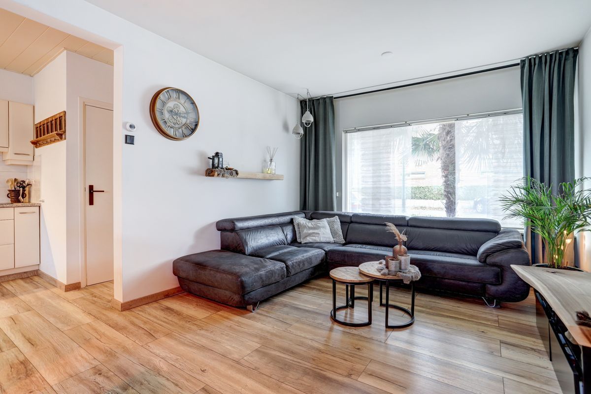 Bij binnenkomst in de leefruimte valt het direct op: de woonkamer en keuken staan in open verbinding met elkaar, wat zorgt voor een prettig gevoel van ruimte en vrijheid. Dankzij de grote raampartijen aan zowel de voor (met rolluik)- als achterzijde valt het daglicht rijkelijk naar binnen, wat bijdraagt aan een lichte en uitnodigende sfeer.