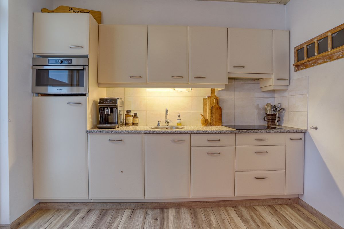 De keuken is uitgevoerd in een neutrale stijl en praktisch opgesteld in een wandopstelling. Er is voldoende onder- en bovenkastruimte voor al je keukenspullen. Daarnaast is de keuken uitgerust met moderne inbouwapparatuur, waaronder een elektrische kookplaat, koelkast, vaatwasser en een combi-oven.
