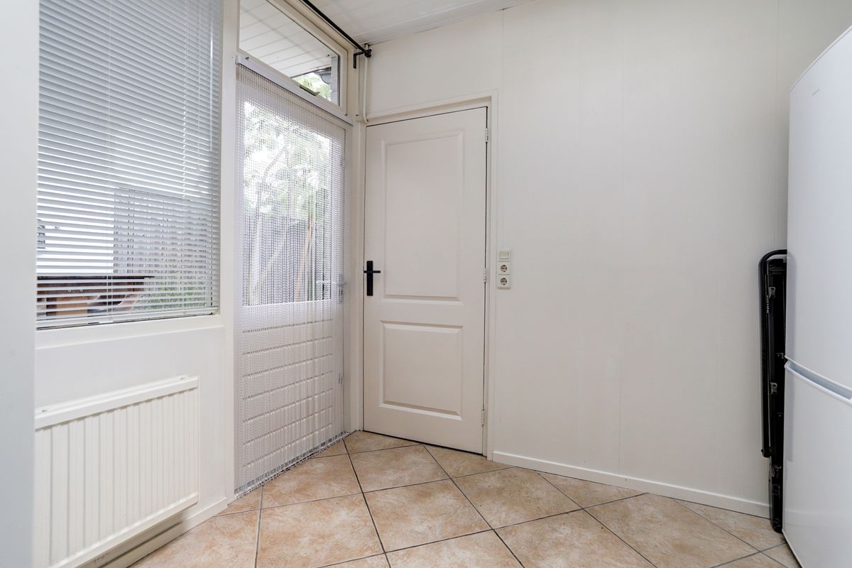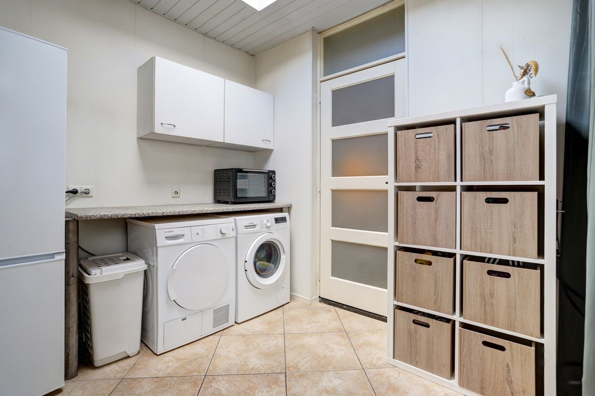Via een fraaie tussendeur met melkglas bereiken we een van de praktische pluspunten van deze woning: de bijkeuken. Hier vind je de aansluitingen voor wasmachine en droger, een deur naar de terrasoverkapping én toegang tot een multifunctionele ruimte (momenteel slaapkamer).