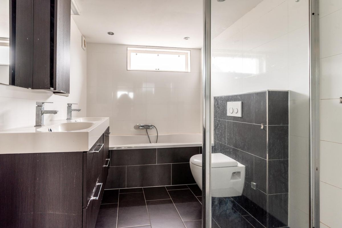 De badkamer is modern uitgevoerd en van alle gemakken voorzien, met een dubbele wastafel met meubel, toilet, ligbad en inloopdouche.