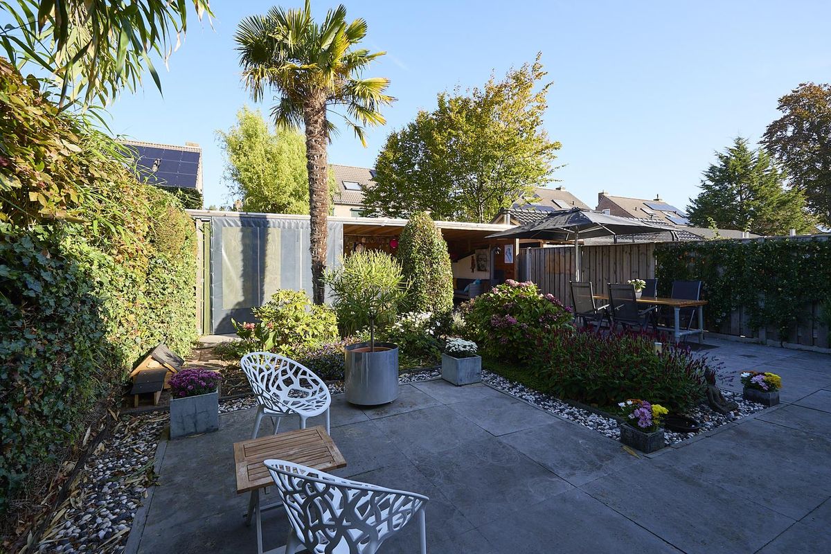 Een tuin met mediterrane flair. De tuin is een waar rustpunt. Dankzij de prachtige palmboom waant u zich hier even in mediterrane sferen. De beplanting is smaakvol en gevarieerd, met groene borders, kleurrijke accenten en meerdere fijne zitplekken. De ruime overkapping met (fietsen)berging maakt van uw tuin een verlengstuk van de woning. Beschut en sfeervol zit u hier van lente tot herfst heerlijk buiten, of het nu gaat om een rustig moment voor uzelf of een gezellige avond met familie of vrienden.