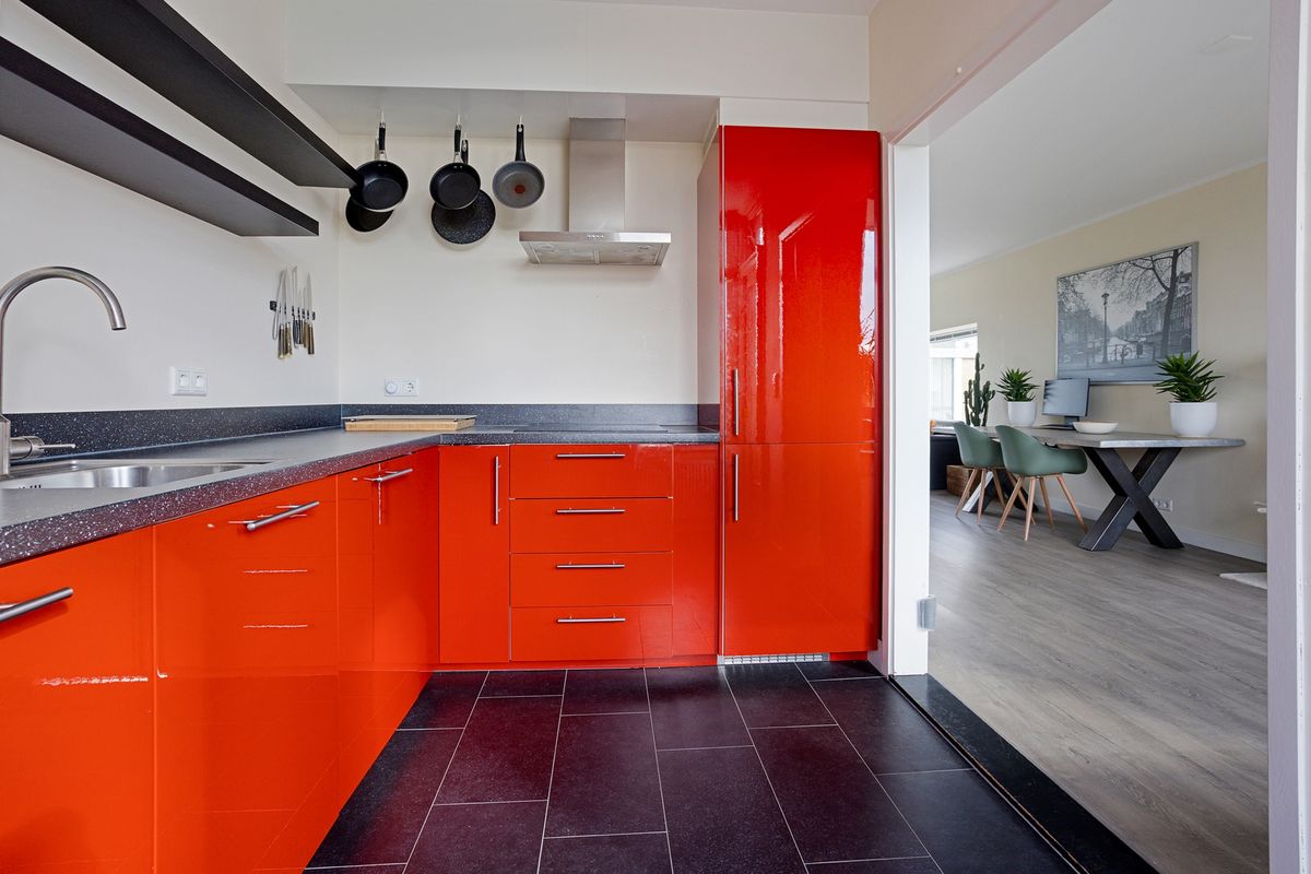 Vanuit de hal toegang tot een slaapkamer, een moderne keuken met inbouwapparatuur en deur naar het zeer zonnige, ruime balkon op het westen.