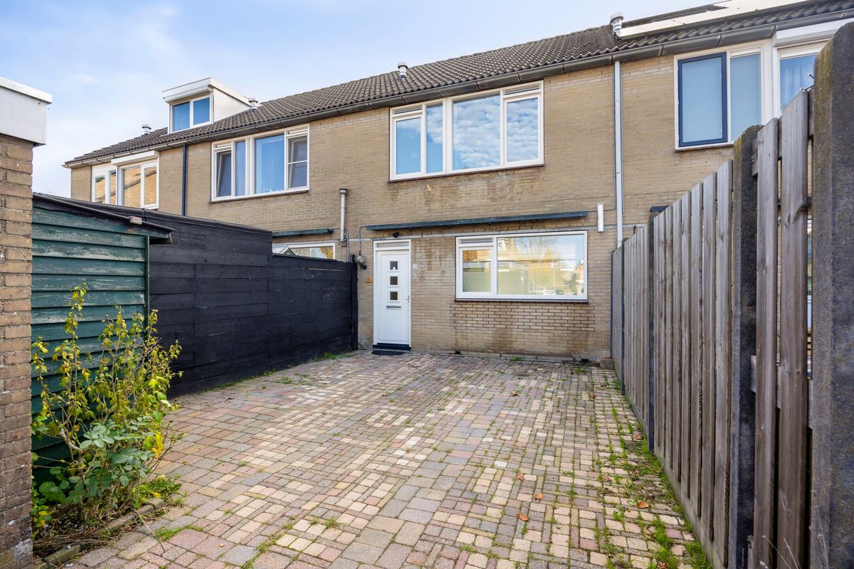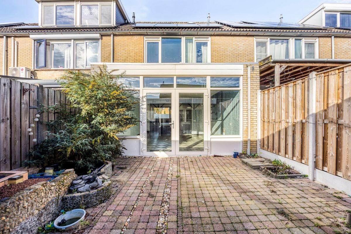 De achtertuin is prettig van formaat en biedt voldoende ruimte voor zowel een loungehoek als een eettafel. Achterin staat een praktische berging voor fietsen en opslag.