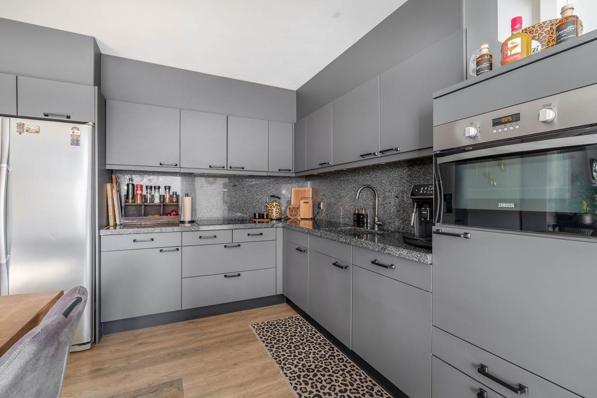 De hal is voorzien van een tegelvloer en bergruimte met de meterkast. In de woonkamer met open keuken ligt eveneens een tegelvloer. Hier is ook een airco aanwezig. De keuken is voorzien van een koelkast, gasfornuis, afzuigkap en oven.