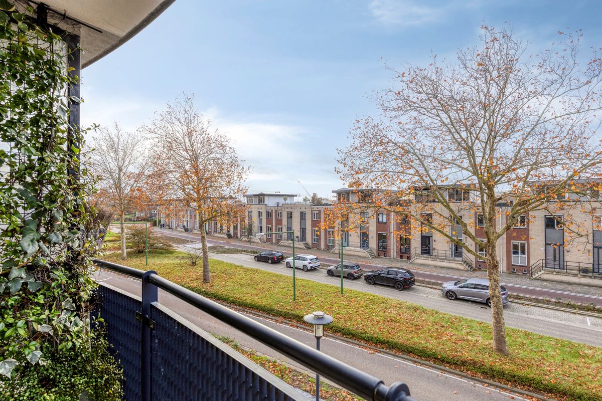 Balkon, een royaal en zonnig balkon (zuiden) met levendig uitzicht, voorzien van tegels op de vloer.