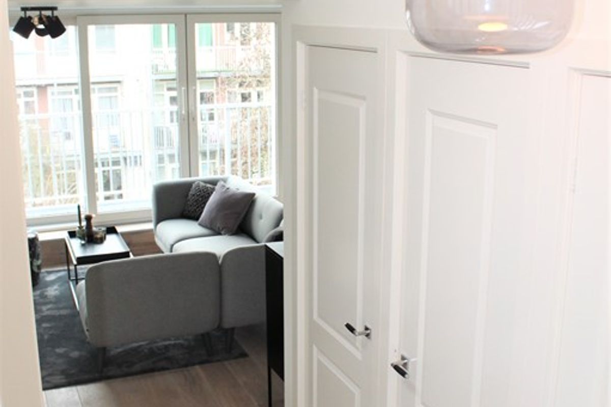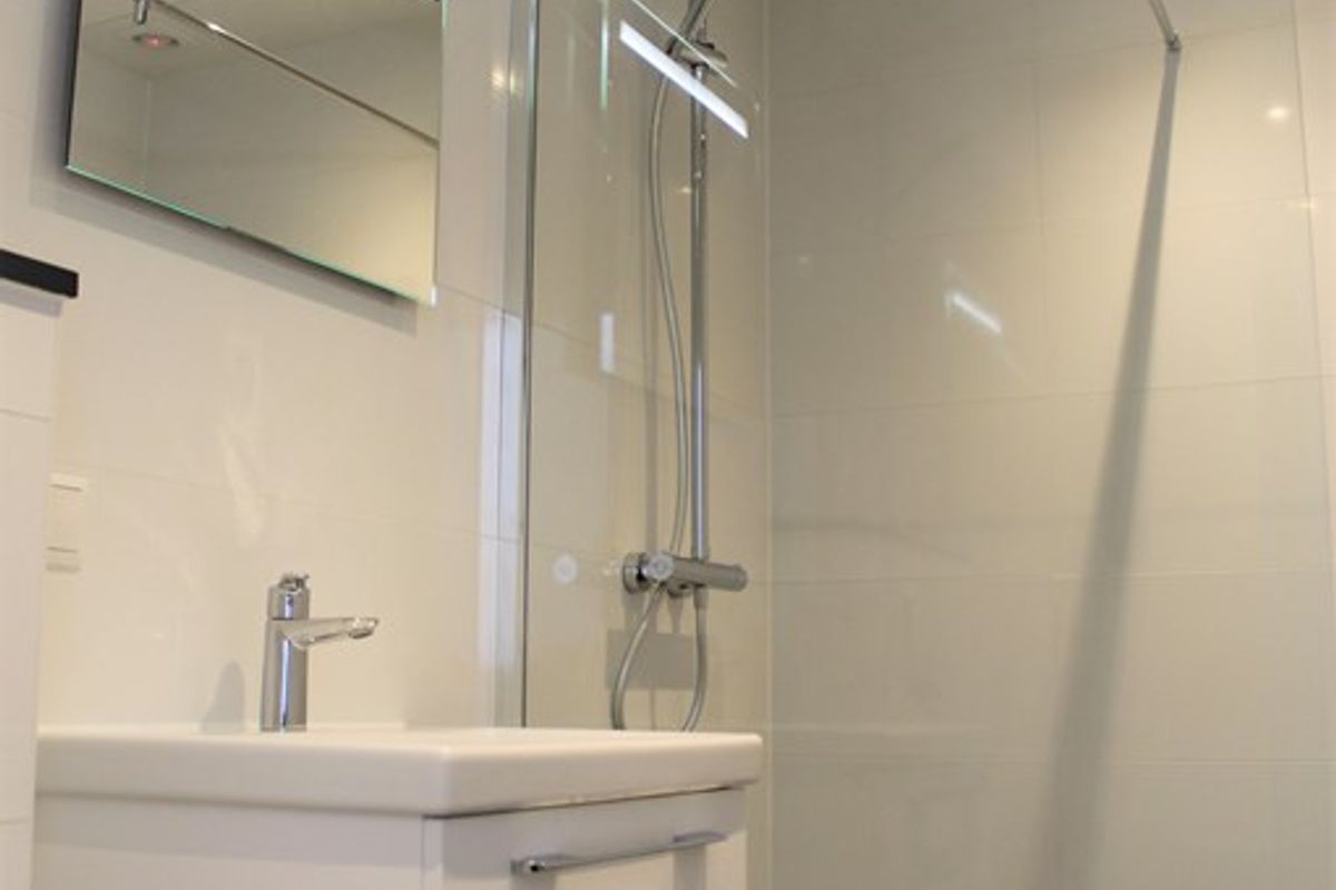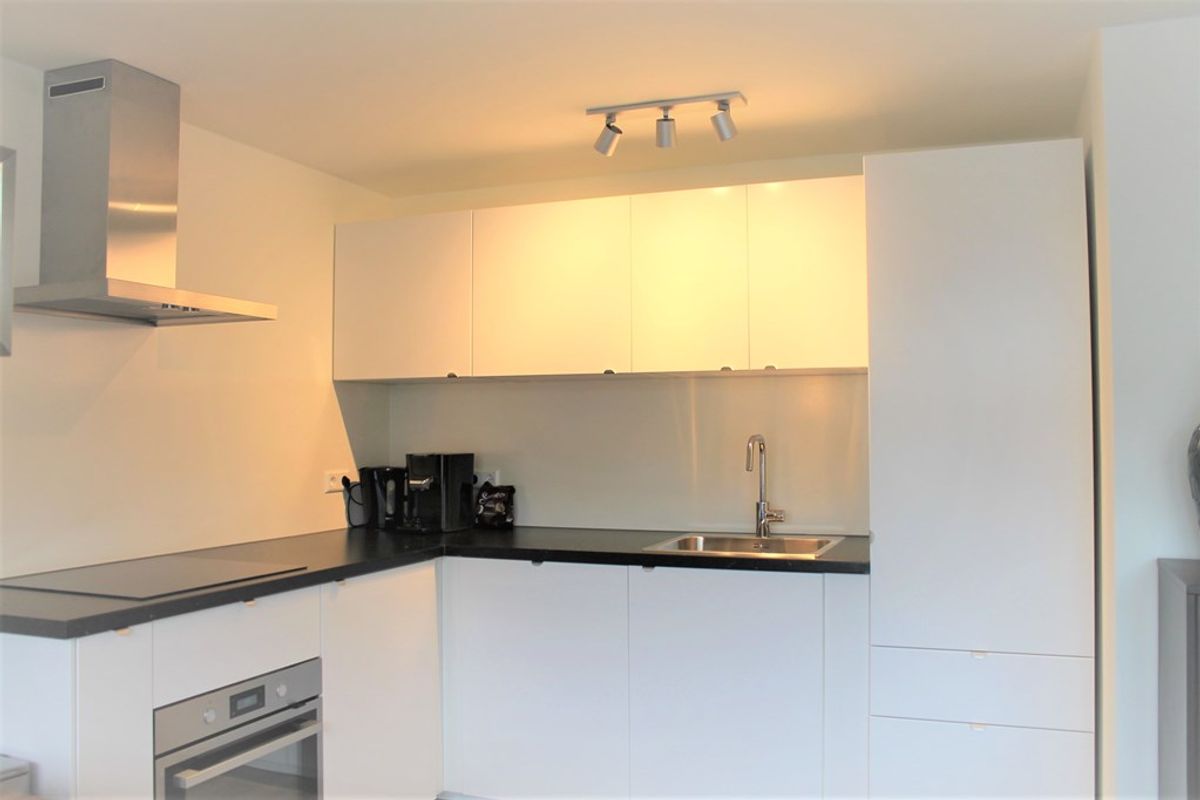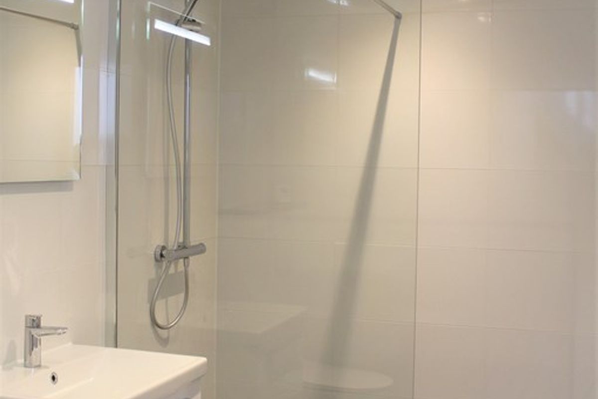 Landing, with at your right hand the staircase to the spacious roof terrace (approx. 20m2), 2 bedrooms (1 large, 1 smaller), luxurious bathroom with toilet, separate laundry room with washer and dryer, and a utility closet. At the back of the apartment you will find the bright living room with open, fully equipped kitchen. From the living room you have access to the sunny balcony via grand sliding doors.
