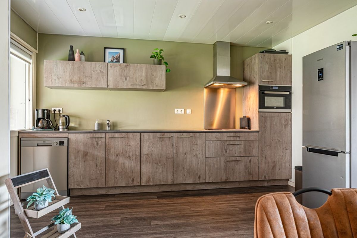 Ruime woonkamer met half open keuken. Volledig voorzien van mooie pvc vloer. De keuken is voorzien van spoelbak, inductiekookplaat, rvs afzuigkap, koelkast, combimagnetron en een losse vaatwasser.