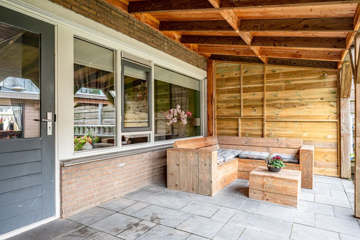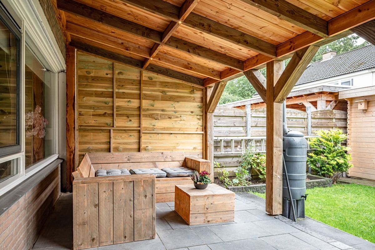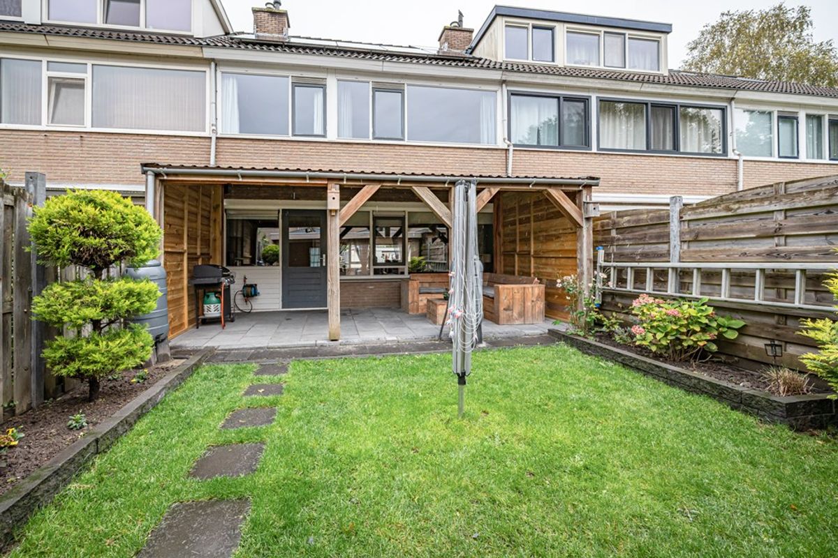 Fraai aangelegde voortuin met een eigen oprit voor de auto een praktische stenen fietsenberging. De achtertuin met terras, gazon en beplanting. Vrijstaande houten berging met elektra en een overkapping. Aan de achtergevel is ook een houten overkapping aanwezig met verlichting en er is een buitenkraan.