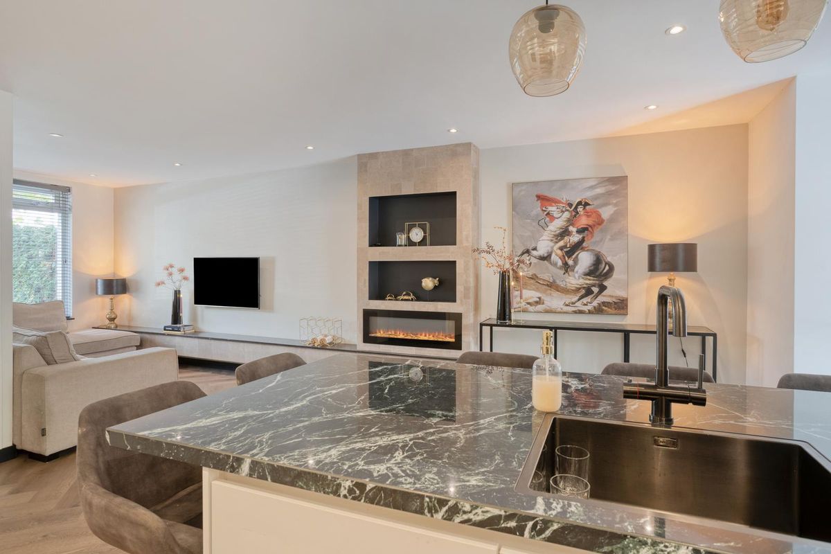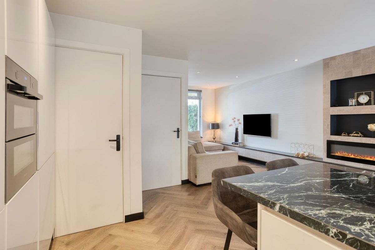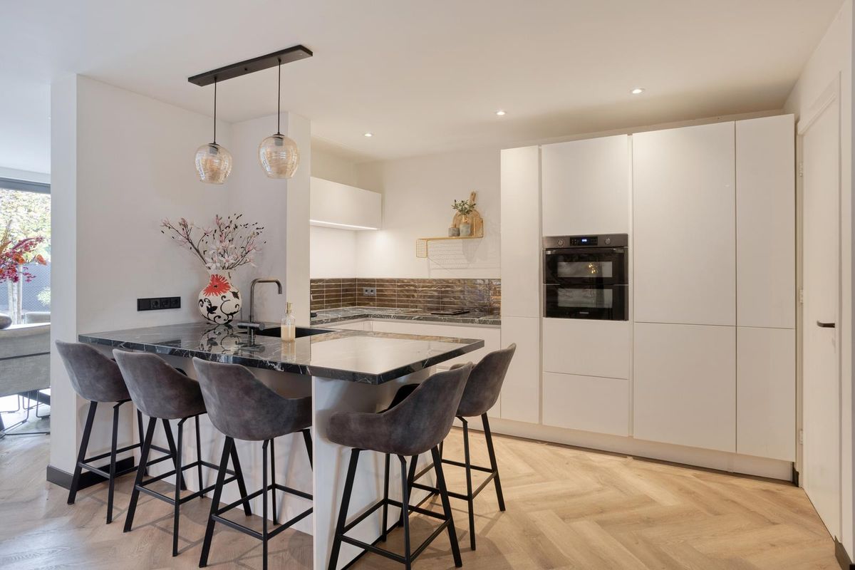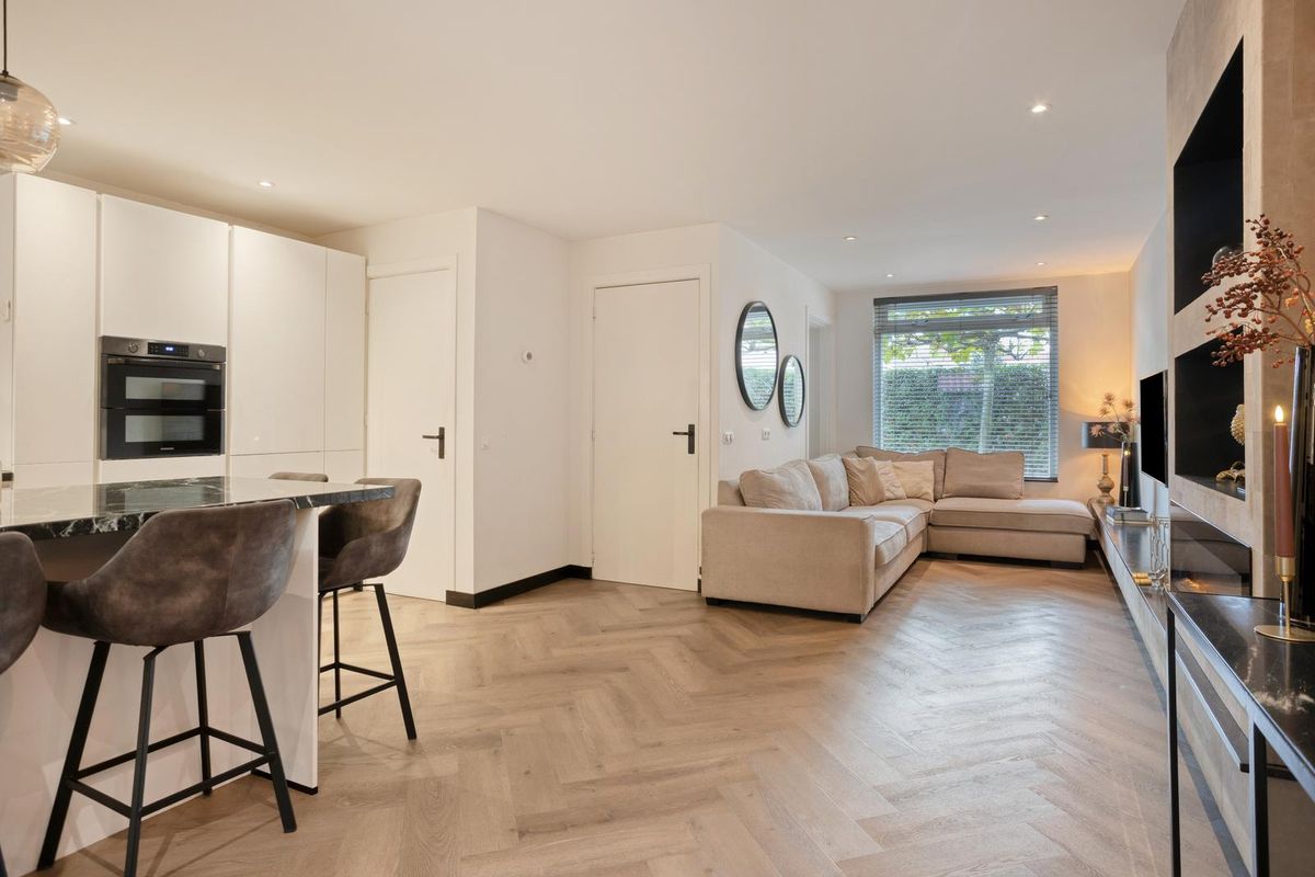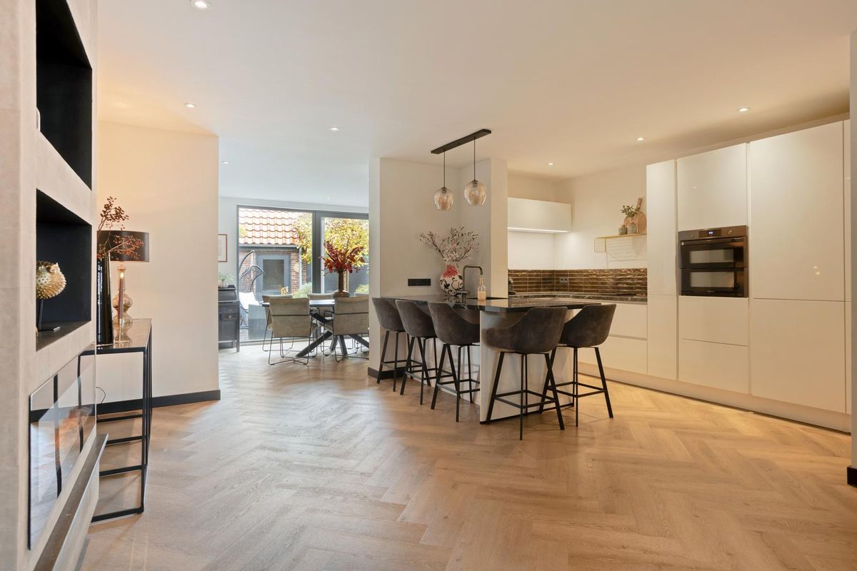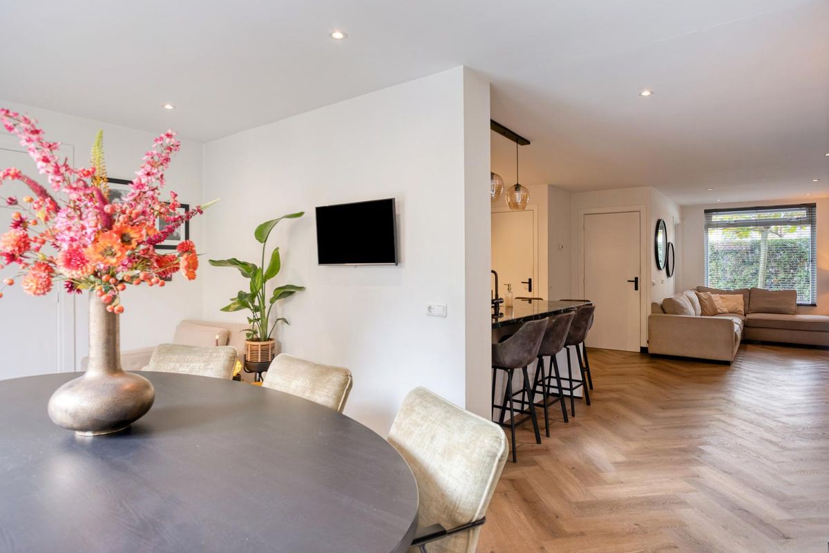 De ruime woonkamer met hoogwaardige visgraat PVC-vloer is een heerlijke plek om samen te komen. Dankzij de grote raampartijen en de schuifdeuren naar de achtertuin valt het daglicht royaal binnen. De open keuken is modern ingericht en voorzien van diverse inbouwapparatuur waardoor koken, tafelen en gezellig borrelen hier moeiteloos in elkaar overlopen.