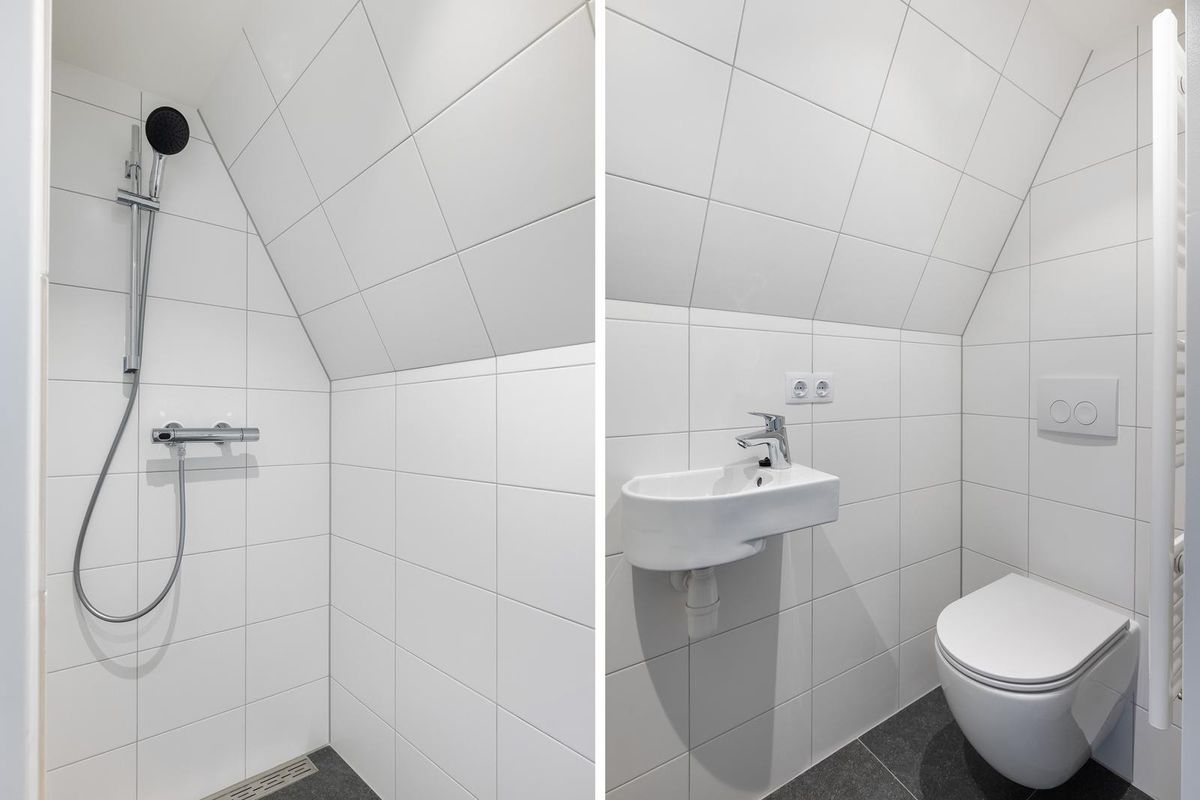 De moderne badkamer is volledig betegeld en beschikt over een inloopdouche, wastafel en toilet.