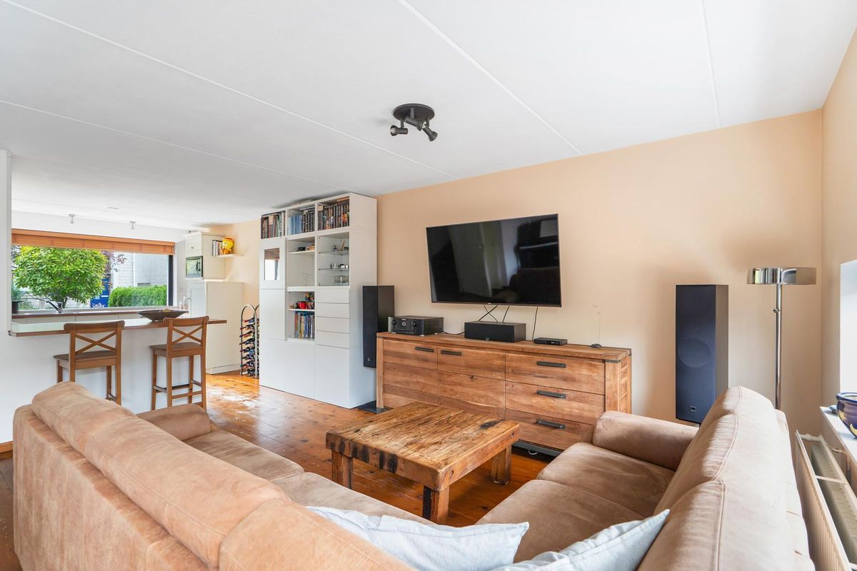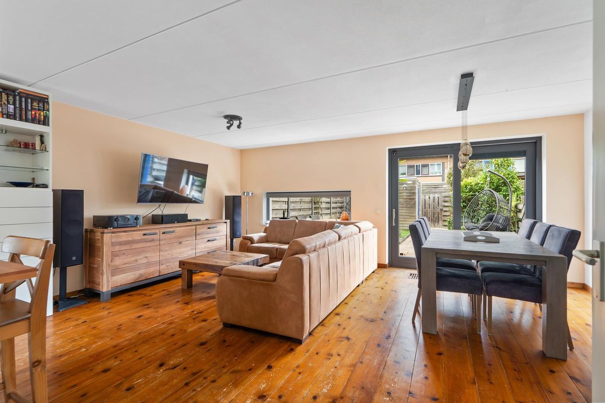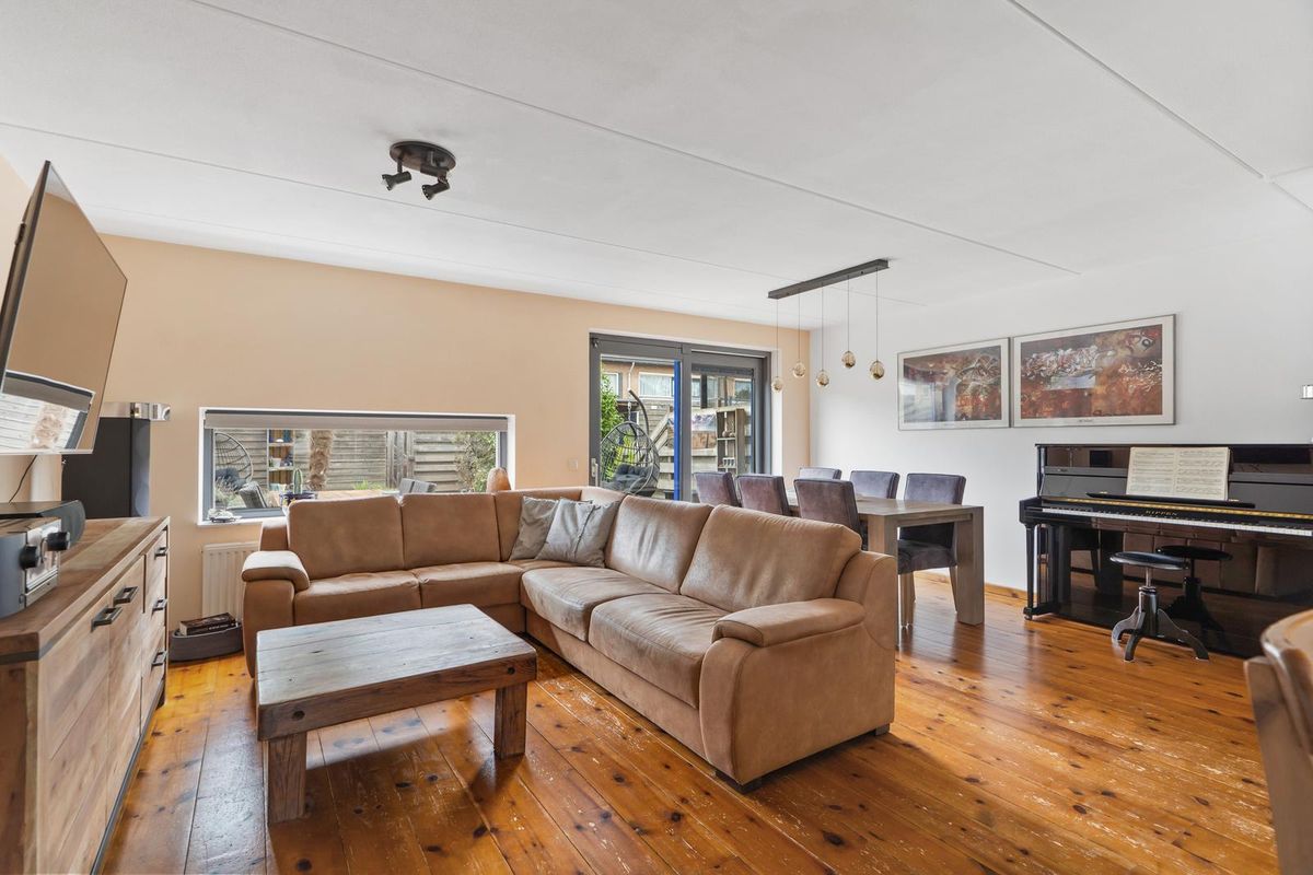 - Brede woonkamer met houten vloer, trapkast en schuifpui