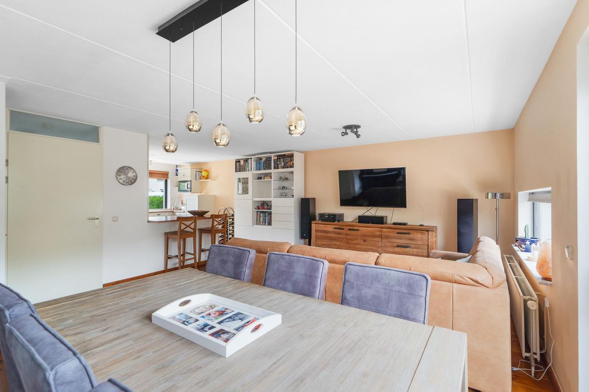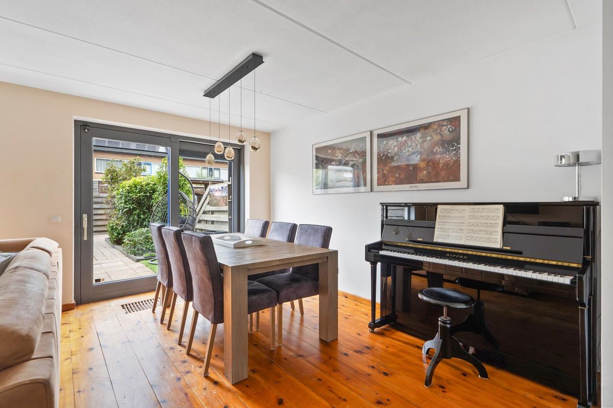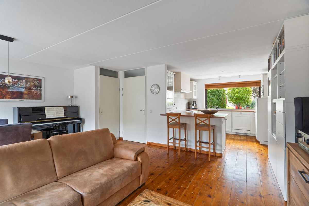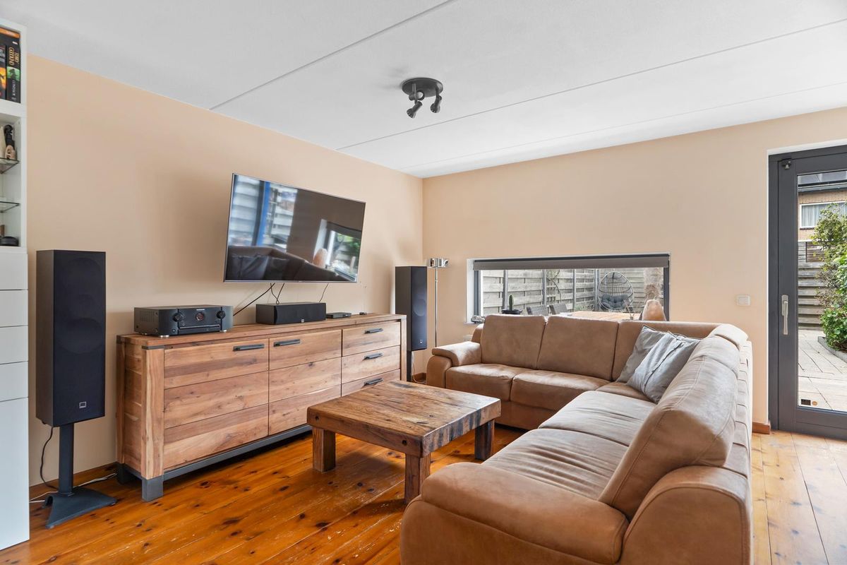 - Brede woonkamer met houten vloer, trapkast en schuifpui