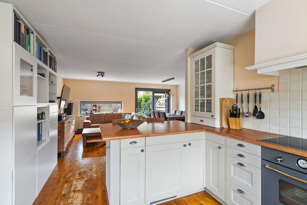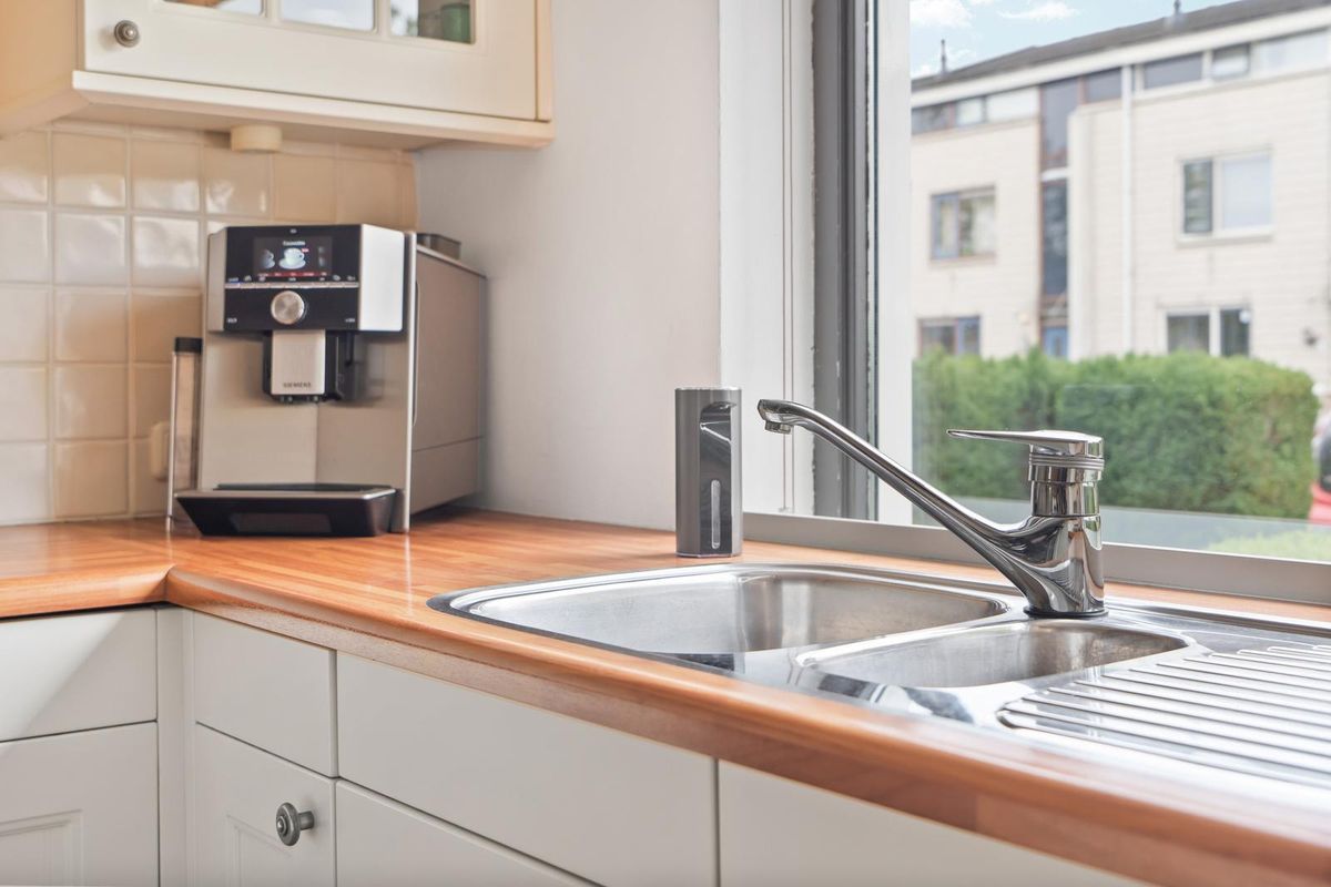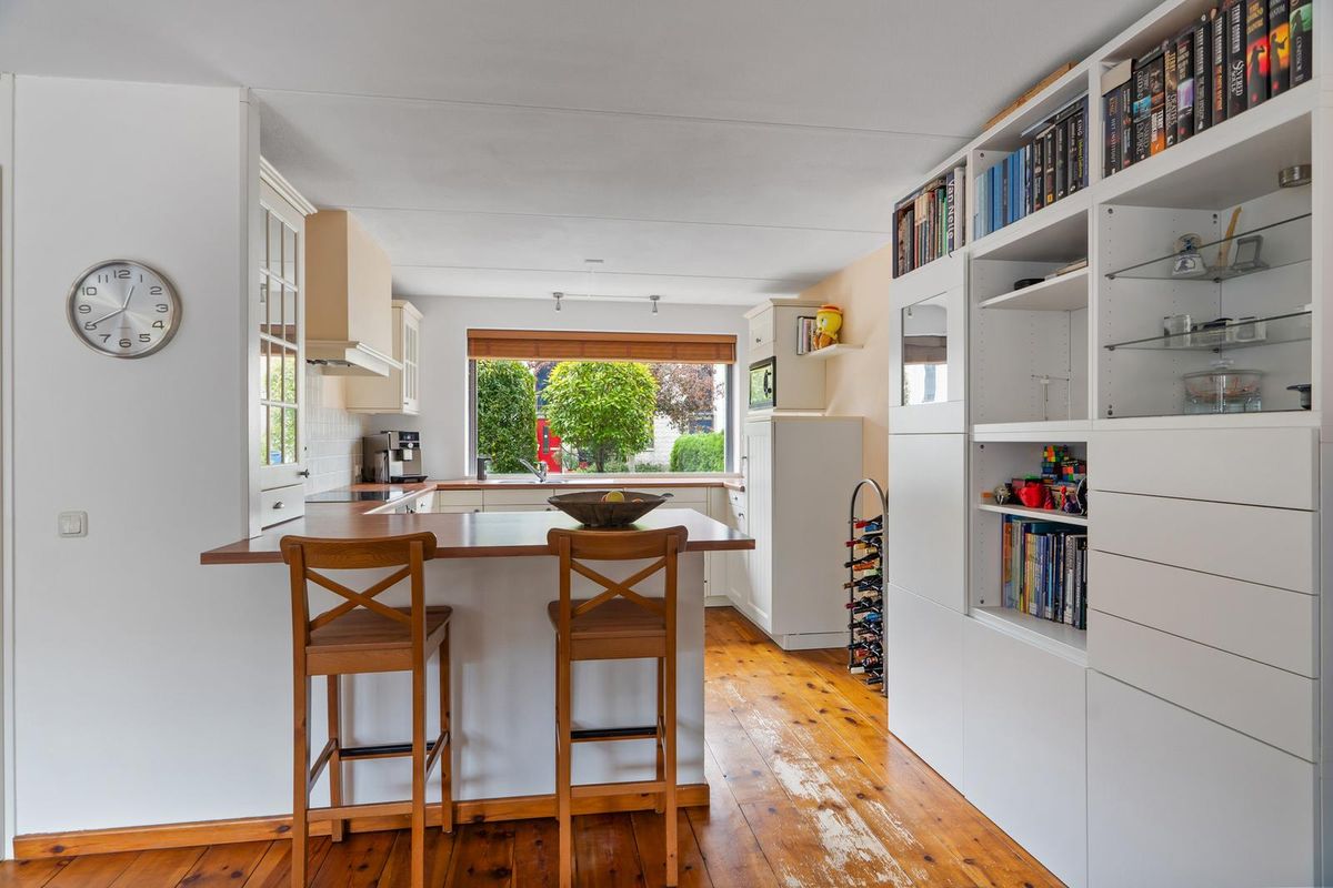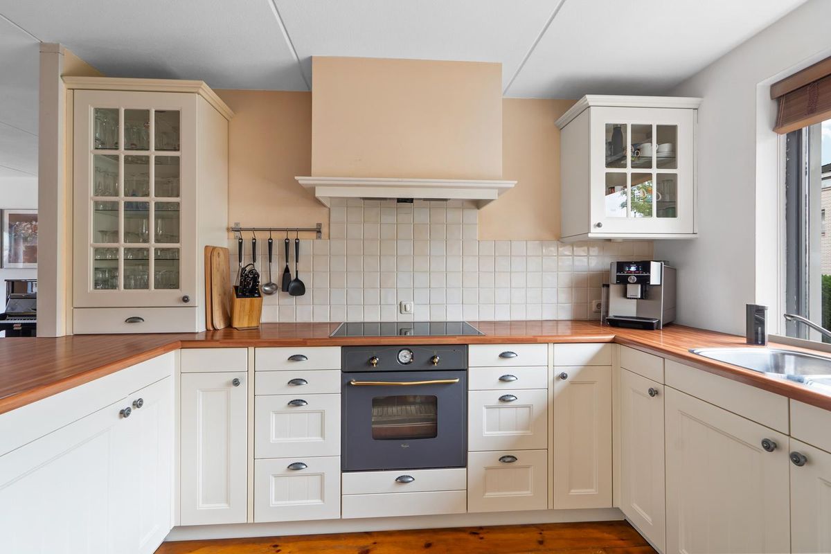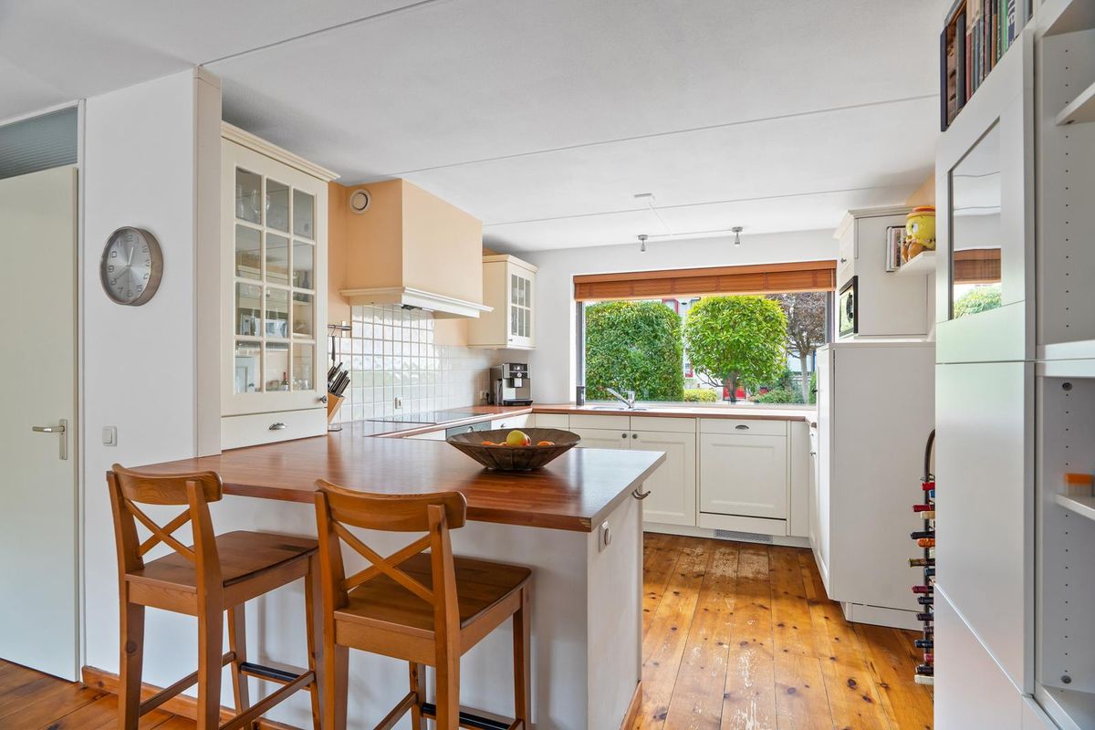 Aan de voorzijde bevindt zich de ruime keuken met schiereiland, compleet met een koelkast, magnetron, oven, vaatwasser, keramische kookplaat en afzuigkap. Het grote raam aan de voorzijde zorgt voor een prettige lichtinval.