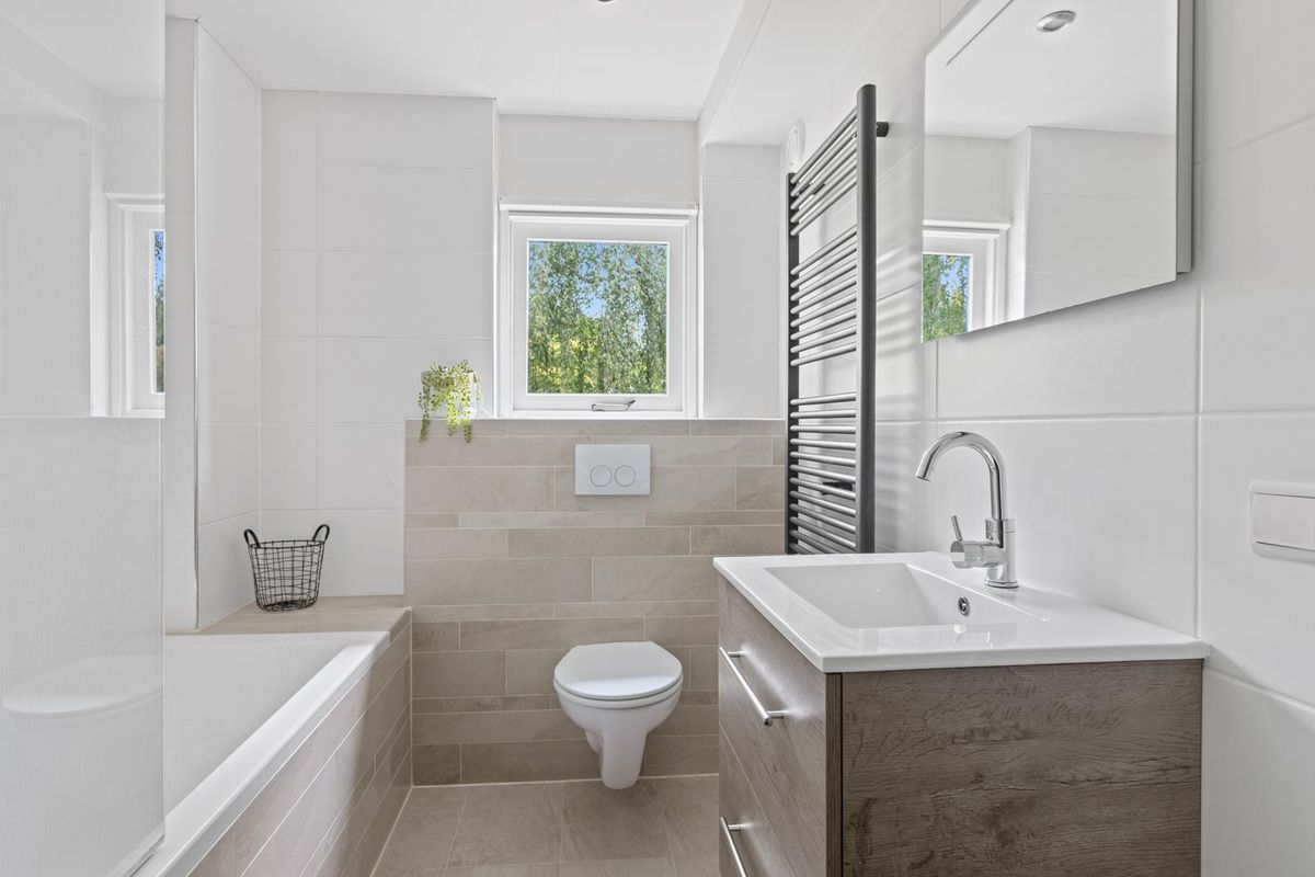 De badkamer is modern en strak afgewerkt met stijlvolle tegels en voorzien van een ligbad met douche, toilet, wastafelmeubel en designradiator – alles wat je nodig hebt voor een frisse start van de dag of een ontspannen bad in de avond.