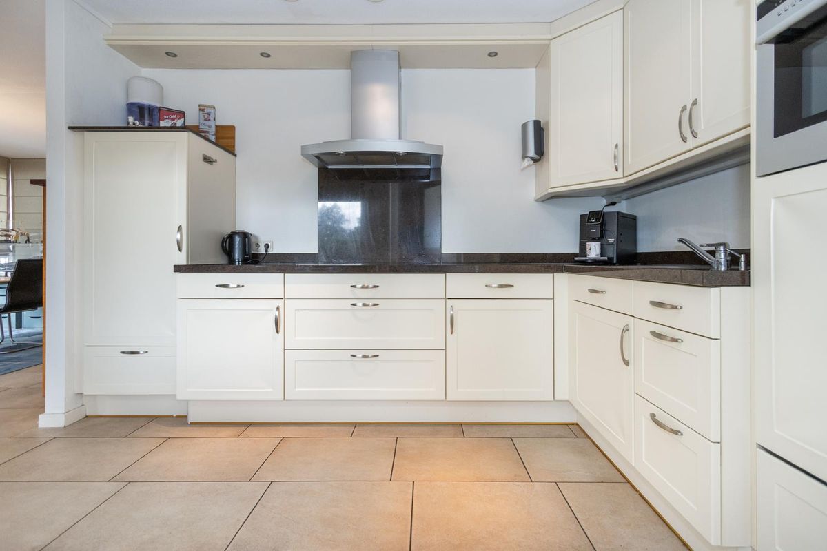 De woonkamer loopt naadloos over in de open keuken, die is afgewerkt met een granieten werkblad en inbouwapparatuur van Siemens en Bosch. Aansluitend vind je de praktische bijkeuken met witgoedaansluitingen en extra bergruimte dankzij vaste kasten met schuifdeuren.