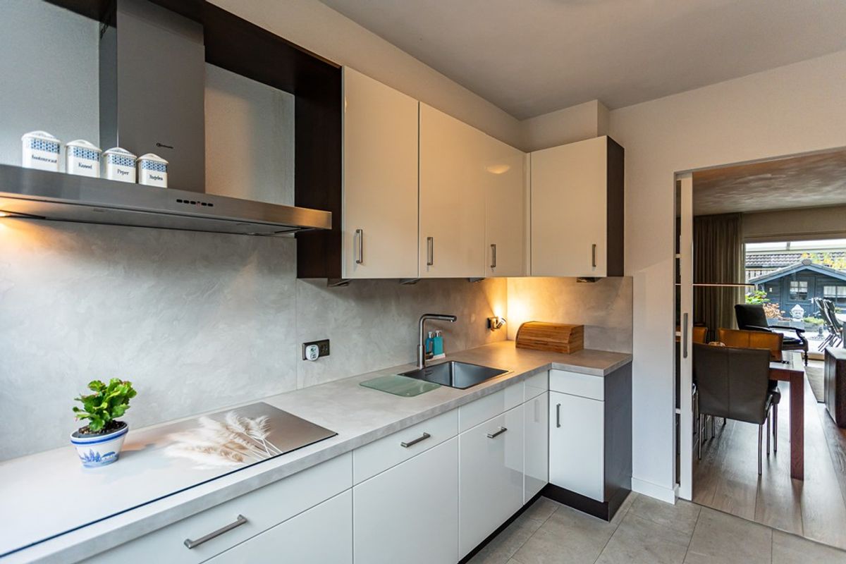 hal/entree, luxe (hang)toilet met fontein, halfopen keuken met luxe. keukenblok in dubbele opstelling met diverse inbouwapparatuur, eet-/woonkamer met bergkast, toegang tot terras en tuin met aluminium overkapping middels kunststof schuifpui.