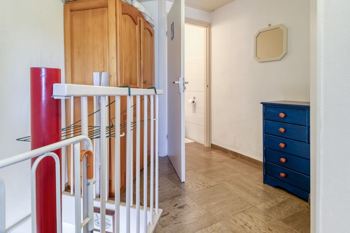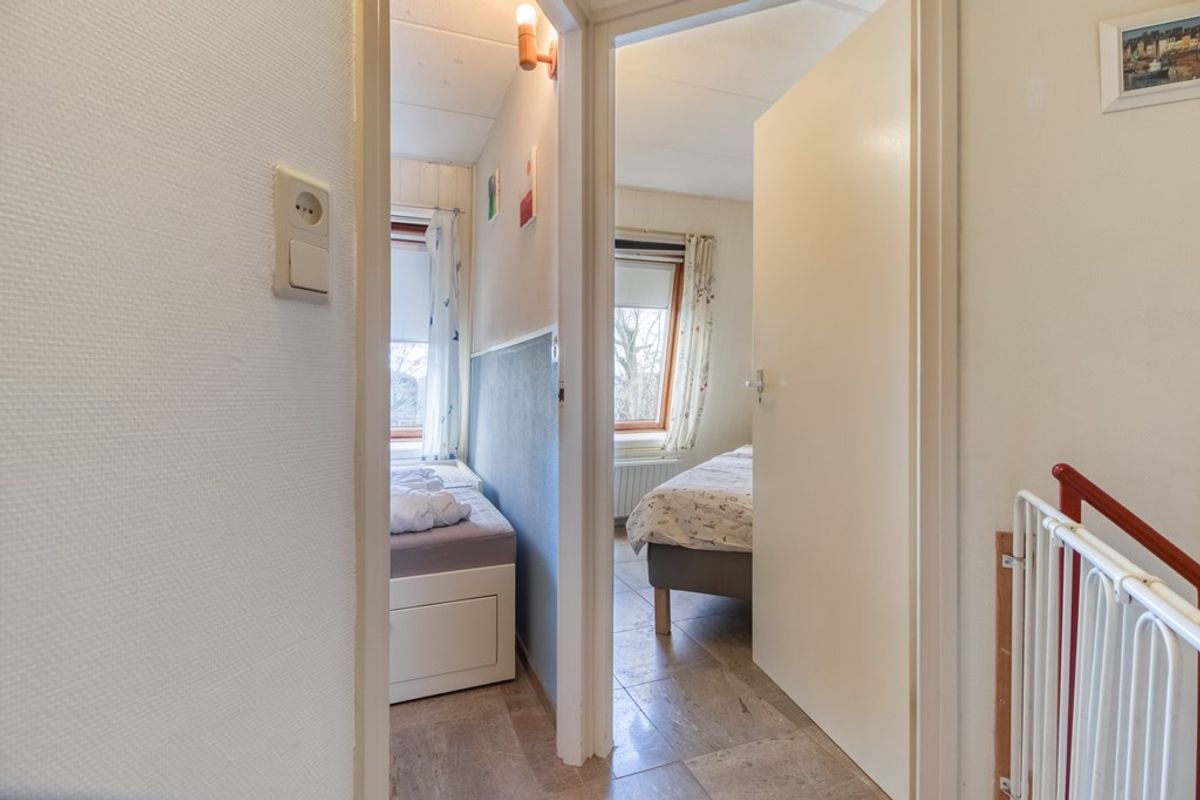 Via de wenteltrap in de woonkamer is de eerste verdieping te bereiken. Hier bevindt zich een ruime overloop die toegang geeft tot de 2 slaapkamers en een tweede toilet met fonteintje.