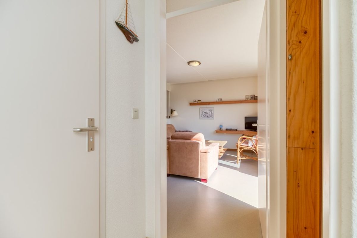 Via de entree komt u in de hal met meterkast en ruimte voor de garderobe. Vanuit de hal is er toegang tot de badkamer, een apart toilet met fonteintje en de woonkamer. De badkamer is voorzien van douche en wastafel. De woonkamer met zit- en eethoek heeft een schuifdeur naar het terras en staat in open verbinding met de keuken. De keuken is voorzien van; 4-pits gaskookplaat, afzuigkap, spoelbak, koelkast en oven. Naast de keuken bevindt zich de bijkeuken met vaatwasmachine en ruimte voor het opbergen van huishoudelijke spullen.