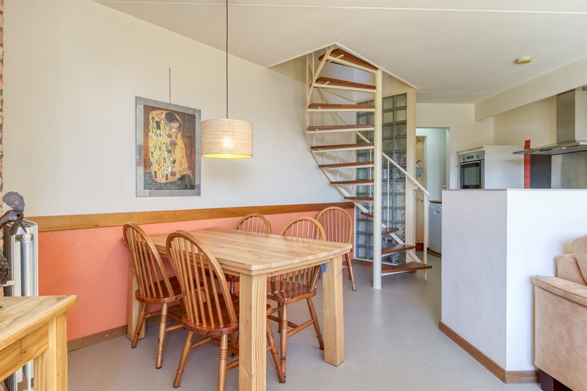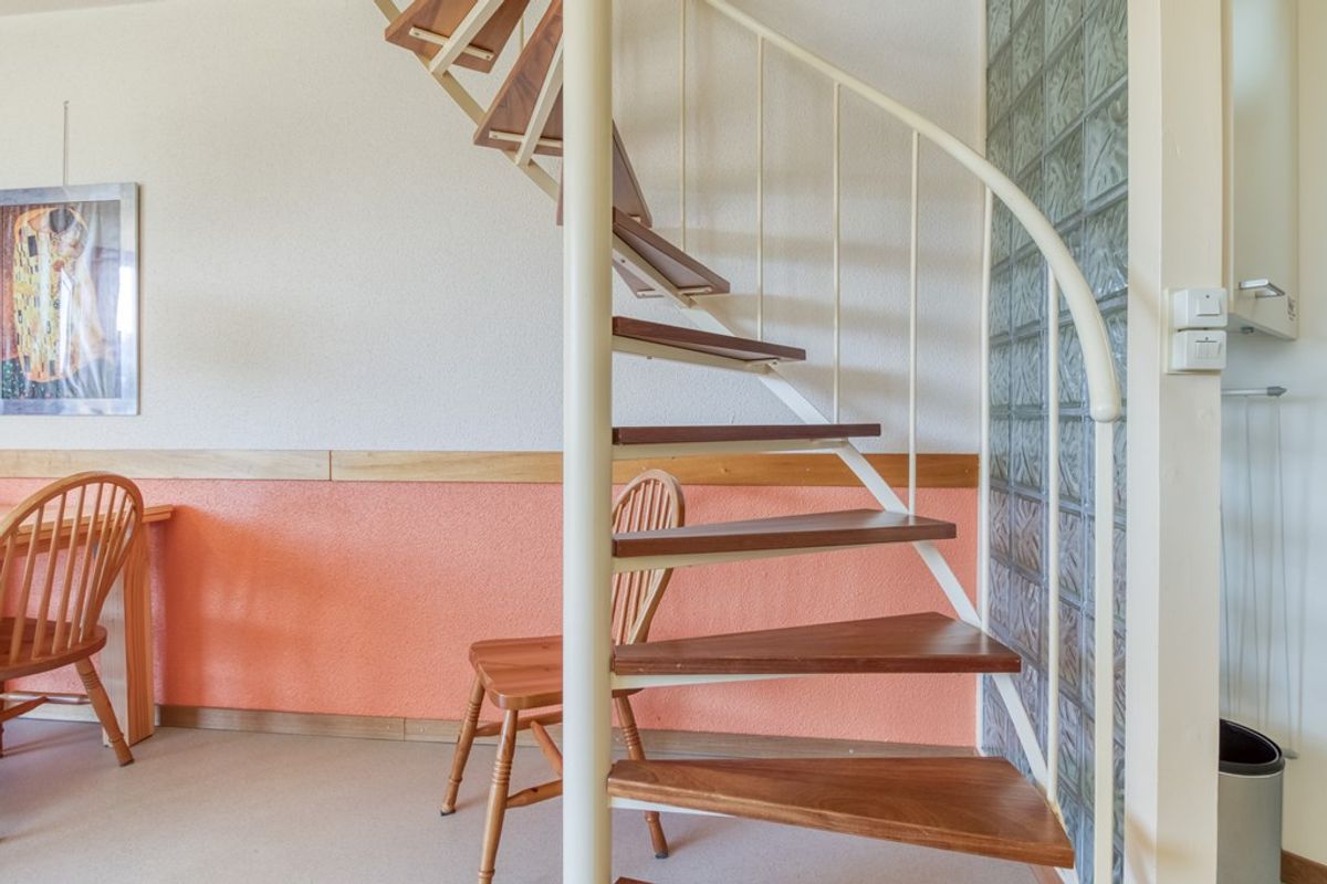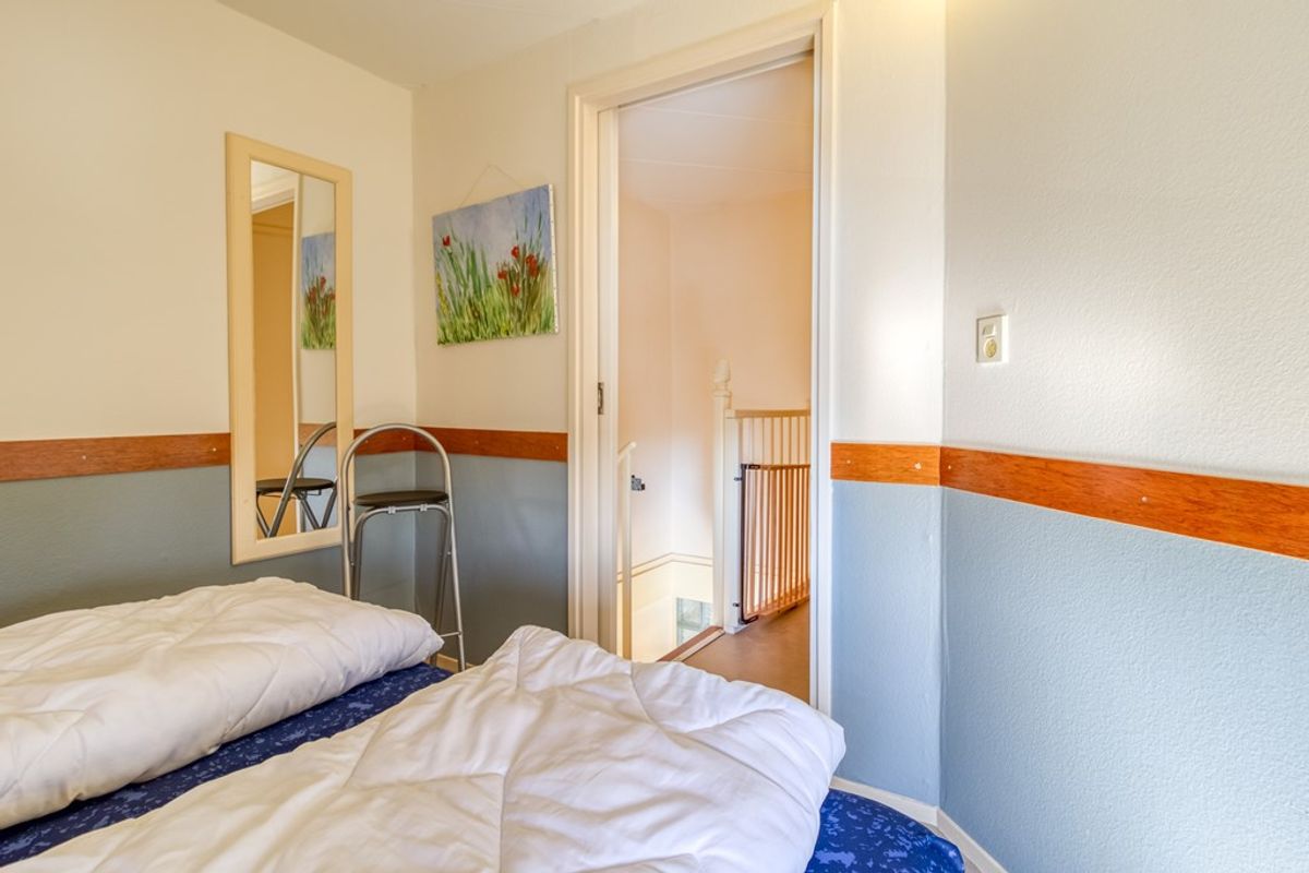 Via de wenteltrap in de woonkamer is de eerste verdieping te bereiken. Hier bevindt zich 2 slaapkamers en een ruime overloop die in gebruik is als 3e slaapruimte.