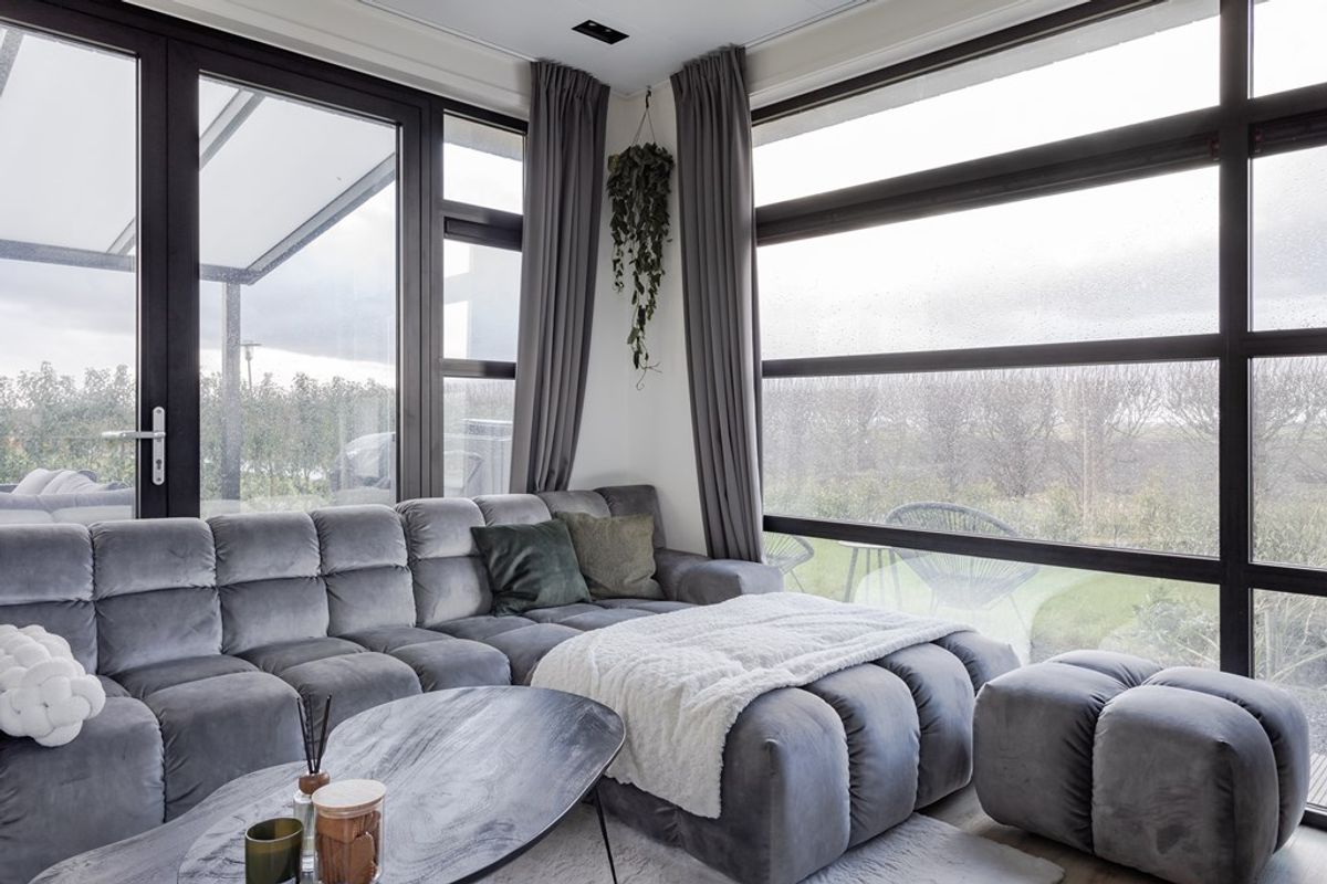 Gezellige living met zicht op de weilanden richting Avenhorn. Op de vloer ligt PVC wat in alle ruimtes is doorgelegd, op de wanden zit vliesbehang en er is een strak systeemplafond met inbouwspots. De airco koelt niet alleen maar verwarmt ook en in de zomer geven de openslaande deuren toegang tot de tuin. Bij de eethoek is een kast met de CV installatie, de groepenkast en tevens bergruimte.