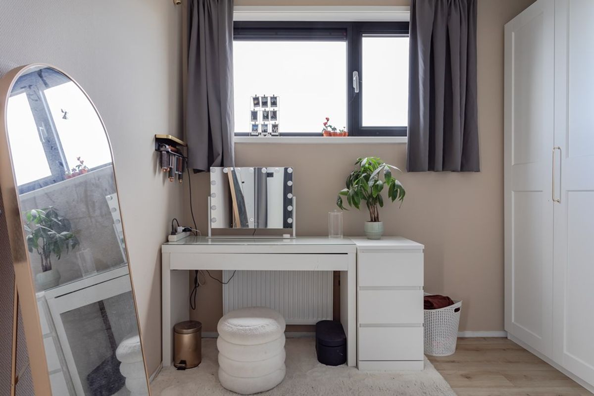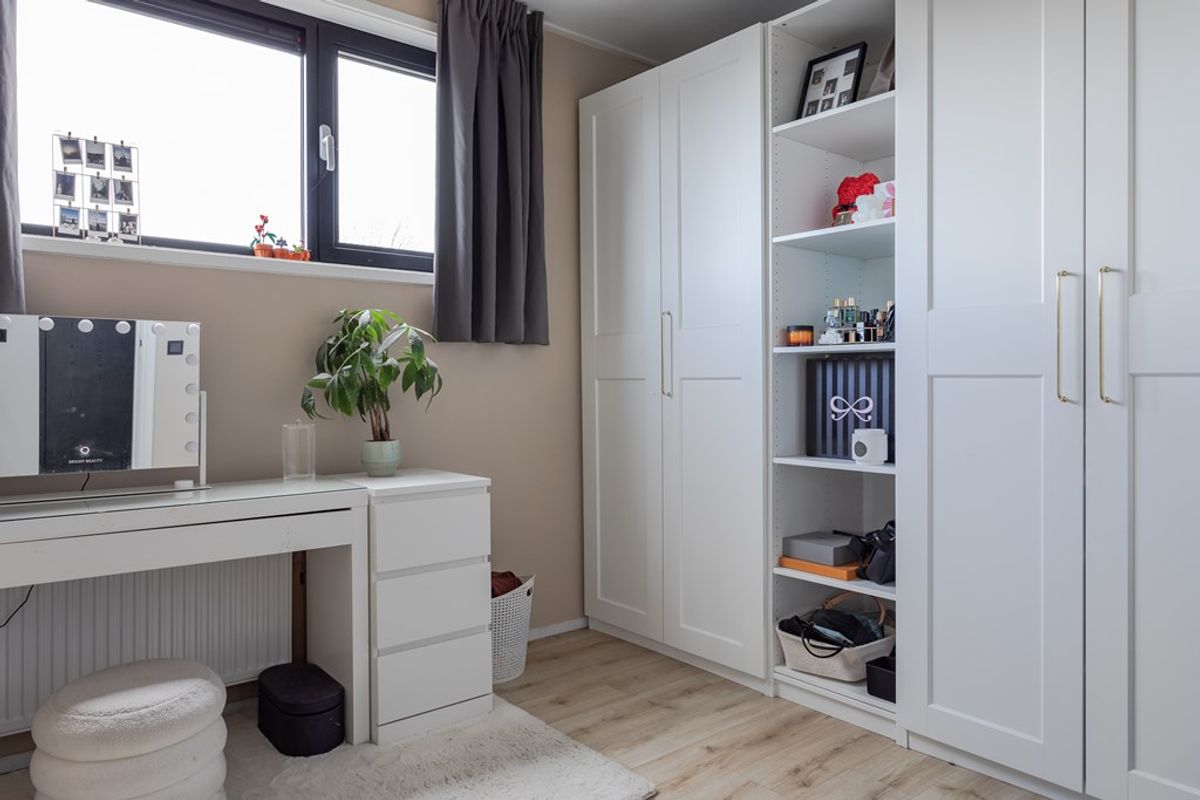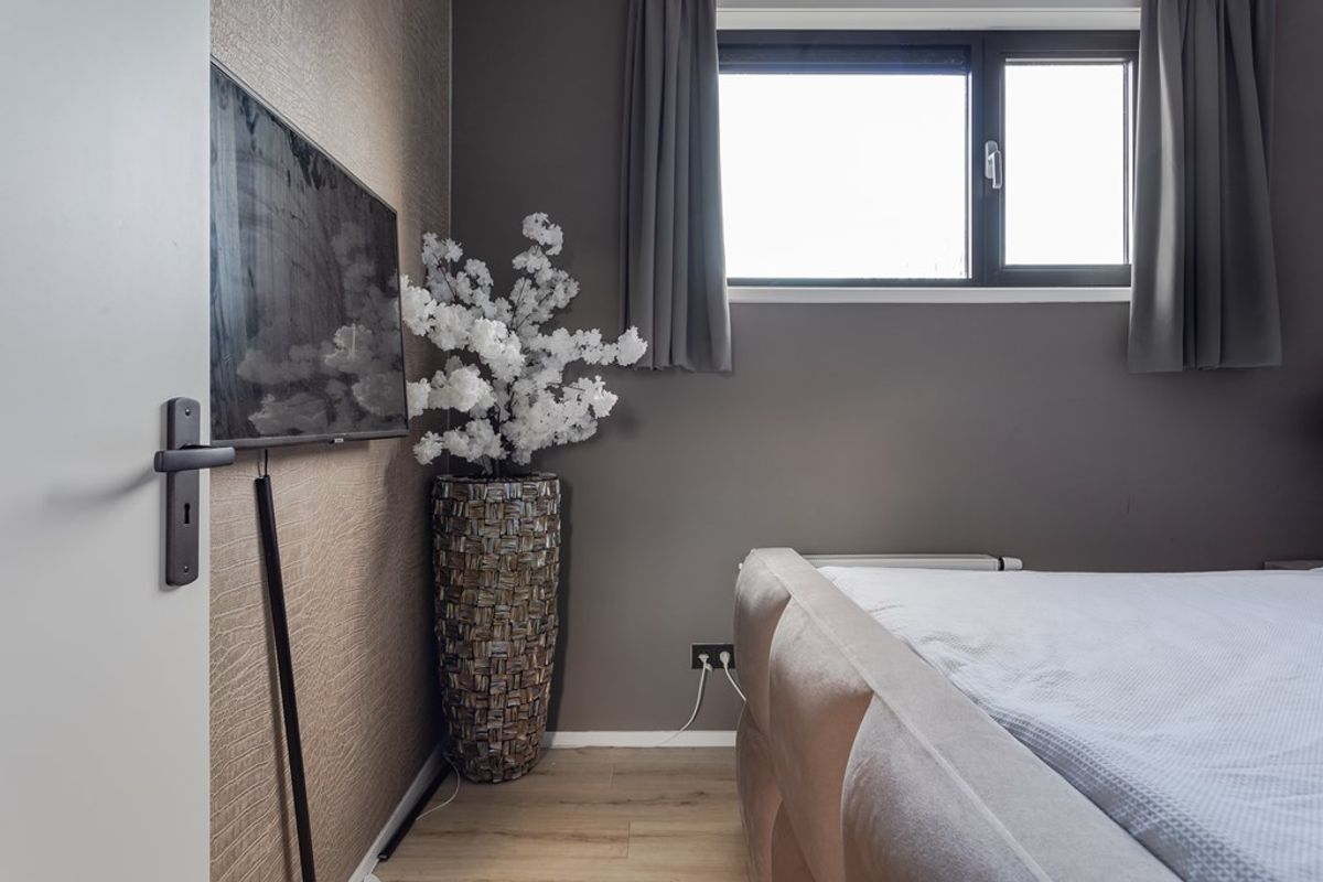 2e Slaapkamer – eveneens een ruime kamer met hoge raampartij voorzien van draai/kiepraam, PVC vloer, vliesbehang en inbouwspots verlichten de kamer.