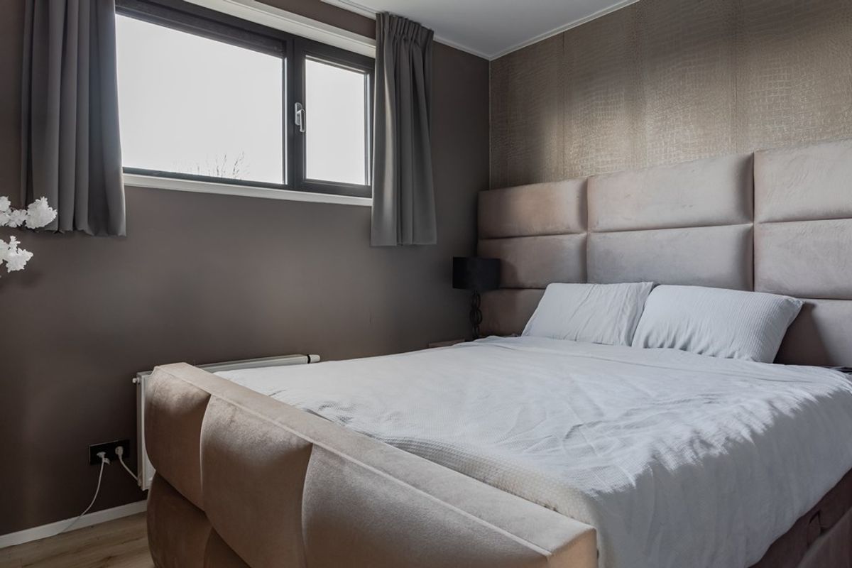 1e Slaapkamer – ruime kamer met hoge raampartij en draai/kiepraam. De PVC vloer is hier doorgelegd, tevens vliesbehang op de wanden en inbouwspots in het plafond.
