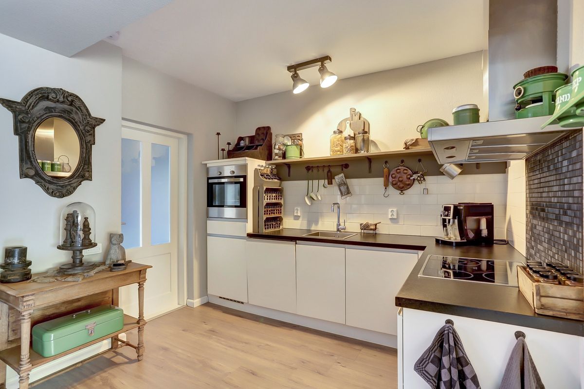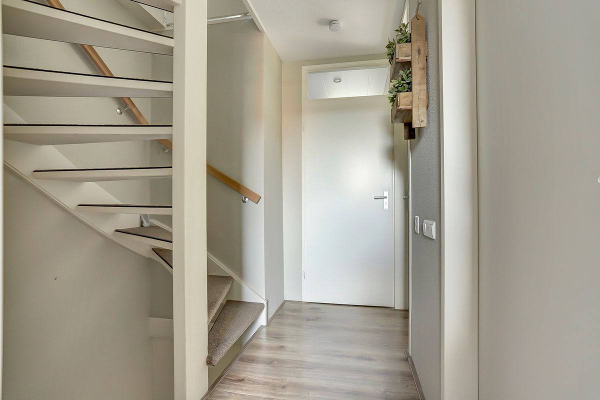 Entree met vaste kast, modern betegeld toilet en trapopgang. Lichte woonkamer met een gezellige zithoek en voldoende ruimte voor een eettafel. De voorzijde is voorzien van een rolluik. De moderne keuken is voorzien van koelkast, vaatwasser, oven, inductiekookplaat en afzuigkap.