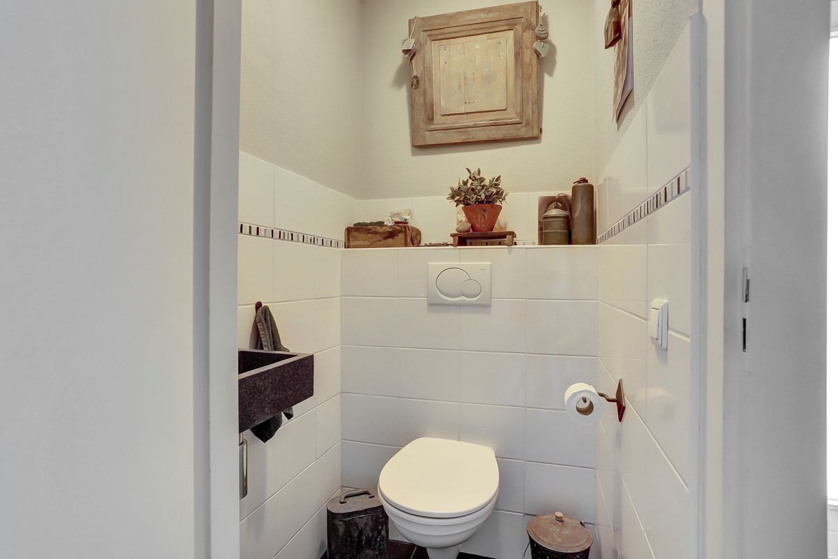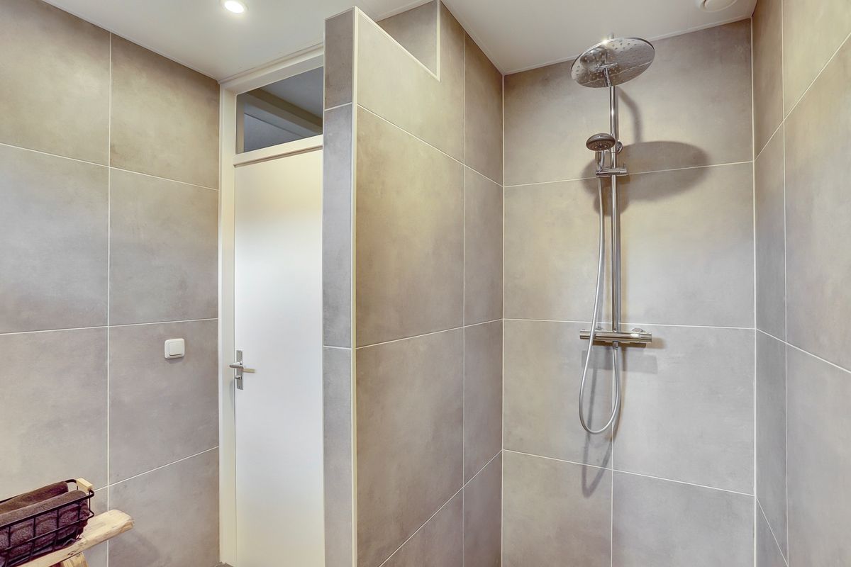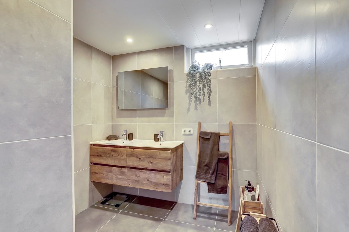 Overloop, drie slaapkamers en een moderne badkamer. De badkamer is volledig vernieuwd in 2023, luxe uitgevoerd, en voorzien van inloopdouche, dubbele wastafel en verwarmde spiegel.