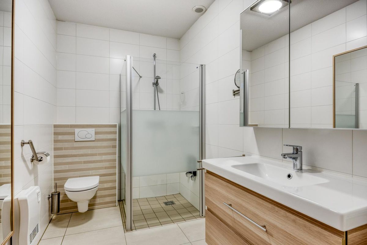 * Moderne licht betegelde badkamer van ca. 2.99 x 1.82 voorzien van douchecabine, 2e zwevend toilet en wastafel met meubel.